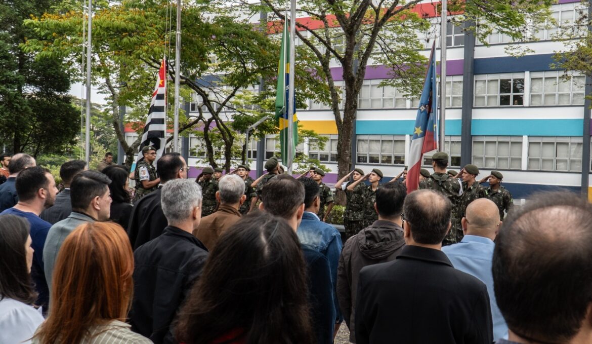 Os atiradores do Tiro de Guerra de Mogi das cruzes fizeram o ato de hasteamento das bandeiras com o acompanhamento da Banda Sinfônica de Mogi das Cruzes, que executou os hinos nacional e do município.