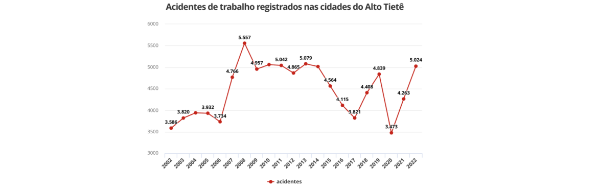 Ao longo de 2022, as cidades do Alto Tietê registraram 5.024 ocorrências de acidente de trabalho. O número, que indica um aumento de 17,8% em relação ao observado no ano anterior, é o maior em quase uma década.
