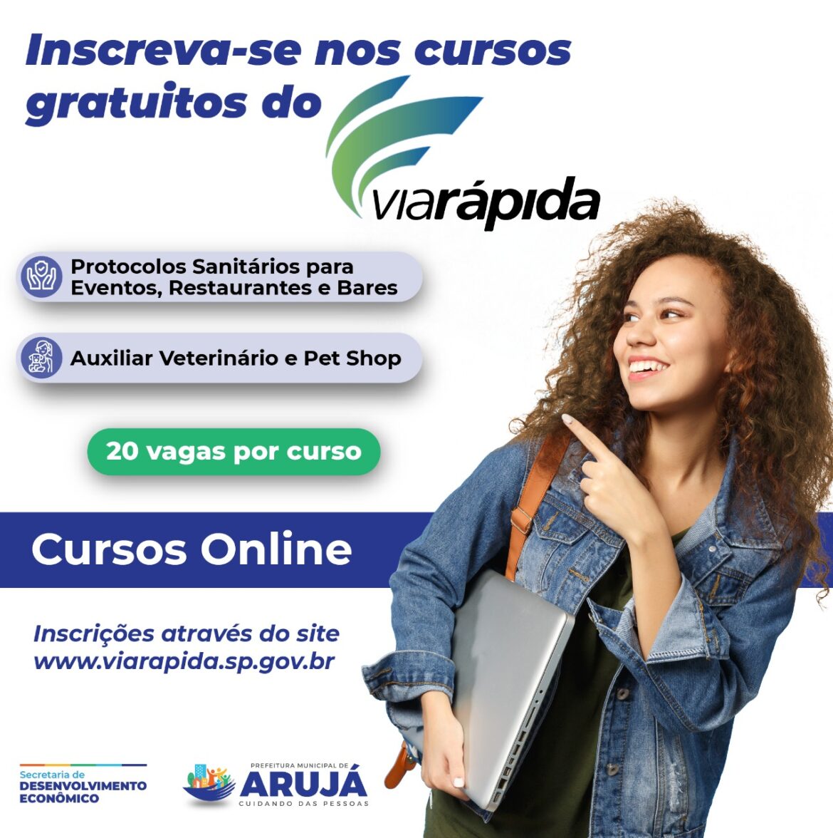 A Prefeitura de Arujá, por meio da Secretaria Municipal de Desenvolvimento Econômico, disponibiliza 40 vagas para dois cursos online e gratuitos do ViaRápida, sendo 20 vagas para curso de Protocolos Sanitários para Eventos, Restaurantes e Bares e 20 vagas para Auxiliar Veterinário e Pet Shop. As inscrições vão até este domingo (07) e podem ser feitas pelo link: https://www.viarapida.sp.gov.br/home