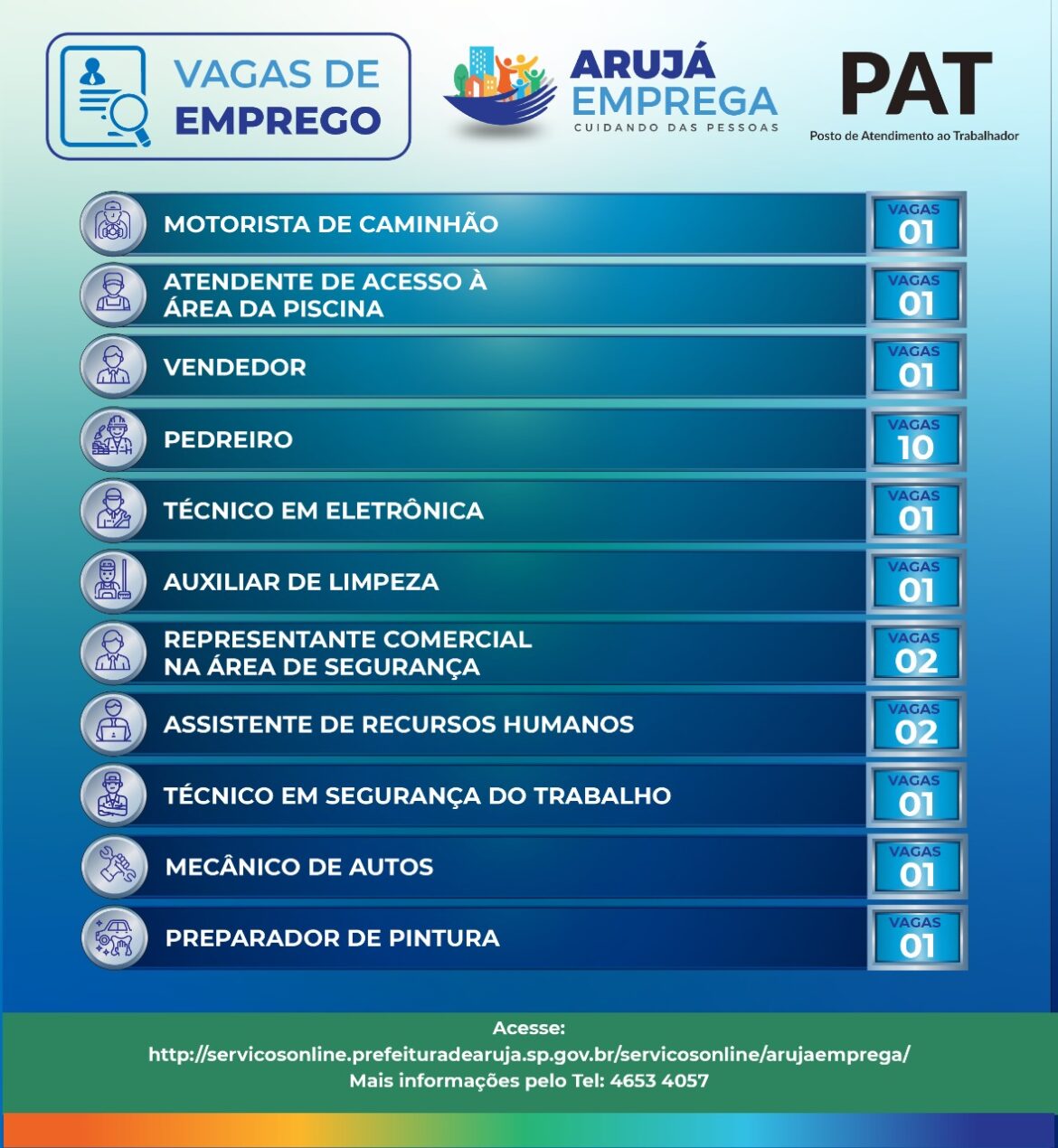 A plataforma digital Arujá Emprega, pertencente à Secretaria Municipal de Desenvolvimento Econômico, e o Posto de Atendimento ao Trabalhador (PAT), estão com novas vagas de emprego para diversas áreas. Os currículos devem ser enviados pelo site do Arujá Emprega (http://servicosonline.prefeituradearuja.sp.gov.br/servicosonline/arujaemprega/).