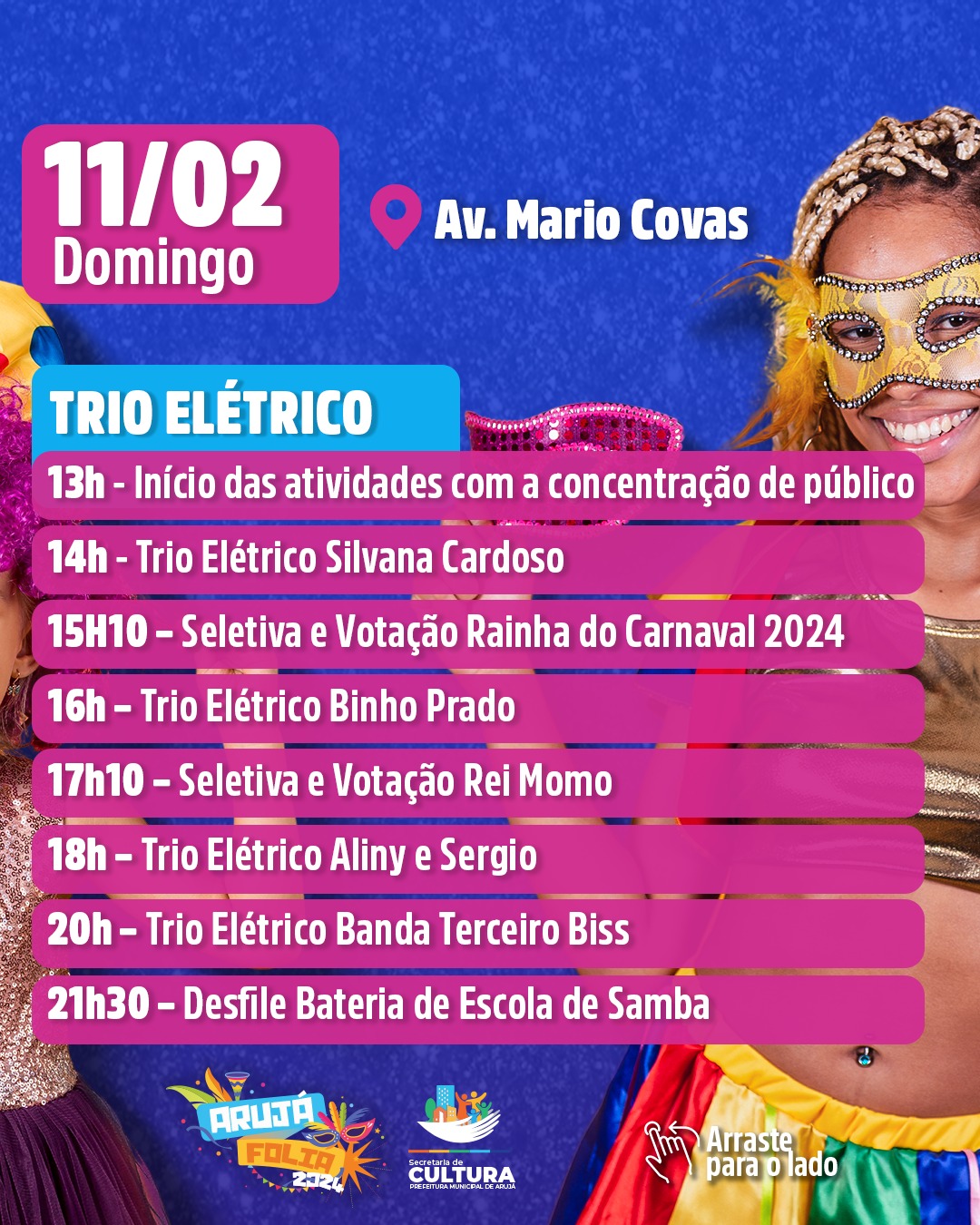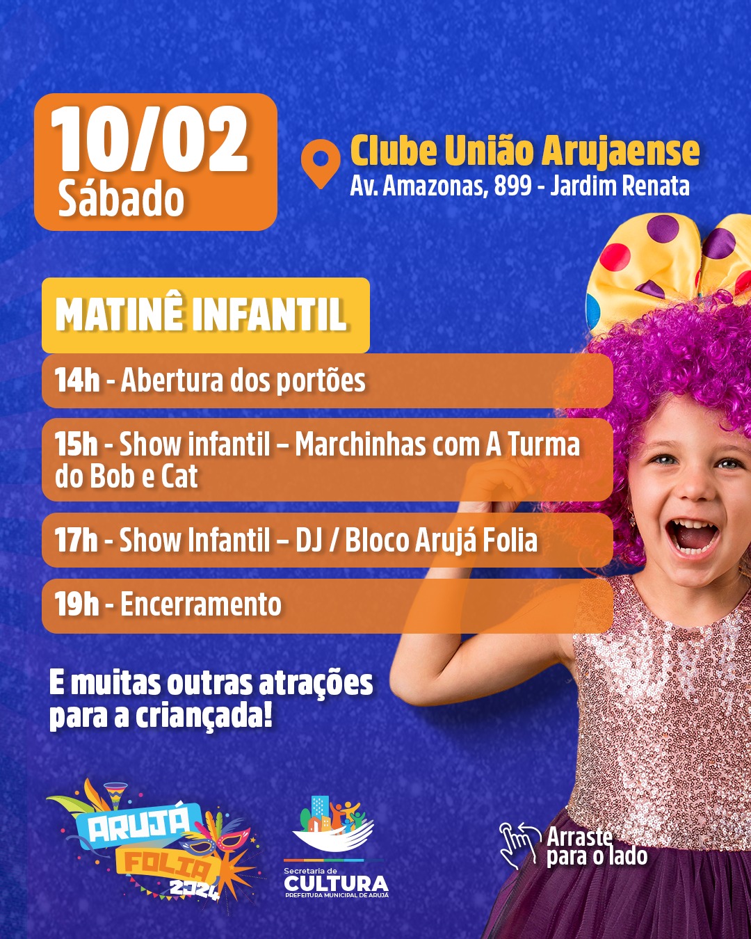 Nos dias 10 e 11 de fevereiro, todos estão convidados para participar da programação do Arujá Folia 2024, preparada pela Secretaria Municipal de Cultura. As atrações contemplam desde o público infantil ao adulto, num ambiente que está sendo preparado para ser acolhedor e divertido para toda a família.No dia 10, no Clube União Arujaense, a festa para as crianças tem início às 14 horas e se encerra às 19h, repleta de marchinhas com a Turma do Bob e Cat, Dj e o Bloco Arujá Folia. Enquanto que, no dia 11, a concentração tem início às 13h com trio elétrico e o Bloco Arujá Folia. No percurso, haverá apresentações de Sil Cardoso, Binho Prado, Aliny e Sérgio, Banda Terceiro Biss e uma atração direto do Carnaval paulista, um desfile da Bateria da Escola de Samba “Dragões da Real”.Vale destacar que, no decorrer da programação do dia 11, haverá o concurso da Rainha e Rei Momo do Carnaval 2024. Realizado pela última vez em 1991, o concurso de Carnaval de Arujá retorna em 2024, com o apoio de Luiz Emídio, dando sequência a essa tradição que celebra alegria, dança e diversidade cultural.O Abadá solidário também está disponível a partir desta sexta-feira (2) e, para garantir o seu, basta contribuir com 1kg de arroz, que será destinado ao Fundo Social de Solidariedade de Arujá. O interessado pode levar o alimento a um dos quatro pontos de troca, sendo: Secretaria de Cultura (Estrada do Kondo, 57, Jd Pinheiro); Museu Municipal (Rua Major Benjamin Franco, 15, Centro); Carol Campos (Rua Prudente de Morais, 110 – Centro) e o Fundo Social (Av. Amazonas, 743, Centro).ENCONTRO MENSAL DE ANTIGUIDADES DE ARUJÁ TAMBÉM TERÁ COMO TEMA O CARNAVALA charmosa Praça do Coreto recebe no dia 18, às 8 às 15h, diversos carros, bicicletas e motos para todos os gostos (antigos, modificados, rebaixados), bem como utensílios domésticos e artigos antigos diversos.O evento conta com a Parceria da Prefeitura de Arujá, por meio da Secretaria Municipal de Desenvolvimento Econômico, e ocorre juntamente com a Feira do Microempreendedor. Colabore doando alimento não perecível (que será destinado ao Fundo Social de Solidariedade). Retire seu cupom e concorra a diversos brindes.