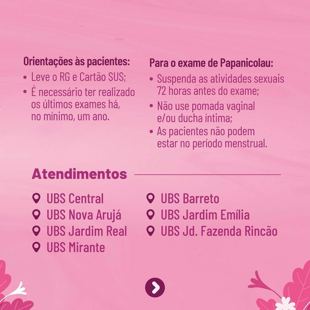 Para realizar os exames, as pacientes devem seguir algumas orientações importantes: é necessário apresentar o RG e o Cartão SUS, ter realizado os últimos exames há, no mínimo, um ano e suspender atividades sexuais por 72 horas antes do procedimento. Além disso, não é permitido o uso de pomada vaginal e/ou ducha íntima por 48 horas antes do exame. As pacientes também não podem estar no período menstrual.