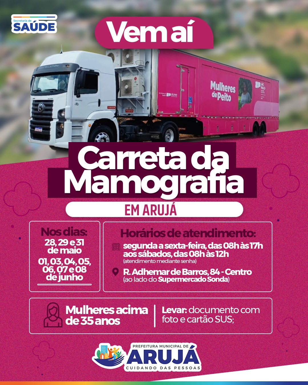 A carreta do programa estadual “Mulheres de Peito”, da Secretaria de Estado da Saúde de São Paulo, inicia nesta terça-feira (28) o atendimento na cidade de Arujá. O veículo ficará estacionado na Rua Adhemar de Barros, nº 84, ao lado do Supermercado Sonda.