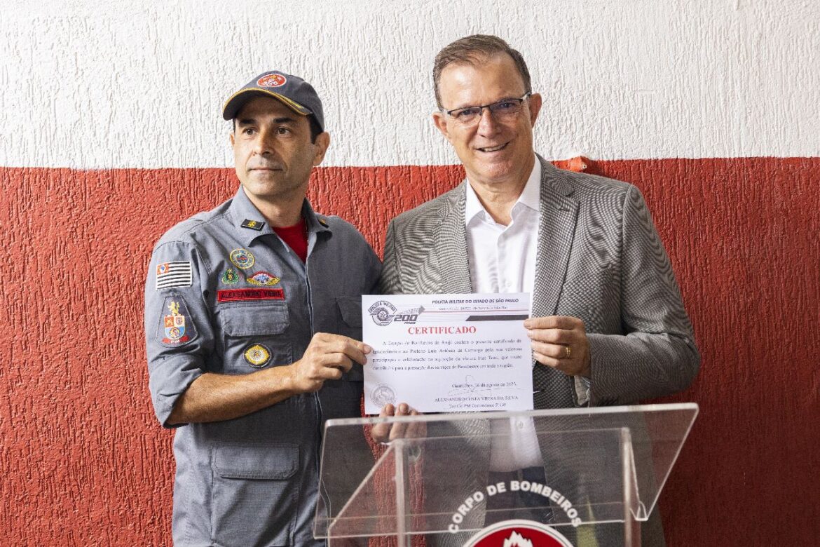 “Nosso relacionamento, sempre baseado em legitimidade e transparência, tem sido o condutor das ações de interesse público que desenvolvemos juntos aqui na linda Cidade de Arujá, onde temos a honra de servir à população. Como singela mostra de gratidão pelo benefício da viatura, homenageamos o prefeito”, manifestou-se o Tenente-Coronel PM Alexsandro Vieira, comandante do 5º Subgrupamento de Bombeiros, que entregou a Dr. Camargo um Certificado de Agradecimento pela “valorosa colaboração” com a corporação. Ele também agradeceu ao vice-prefeito, aos vereadores e a todos os apoiadores dos Bombeiros.