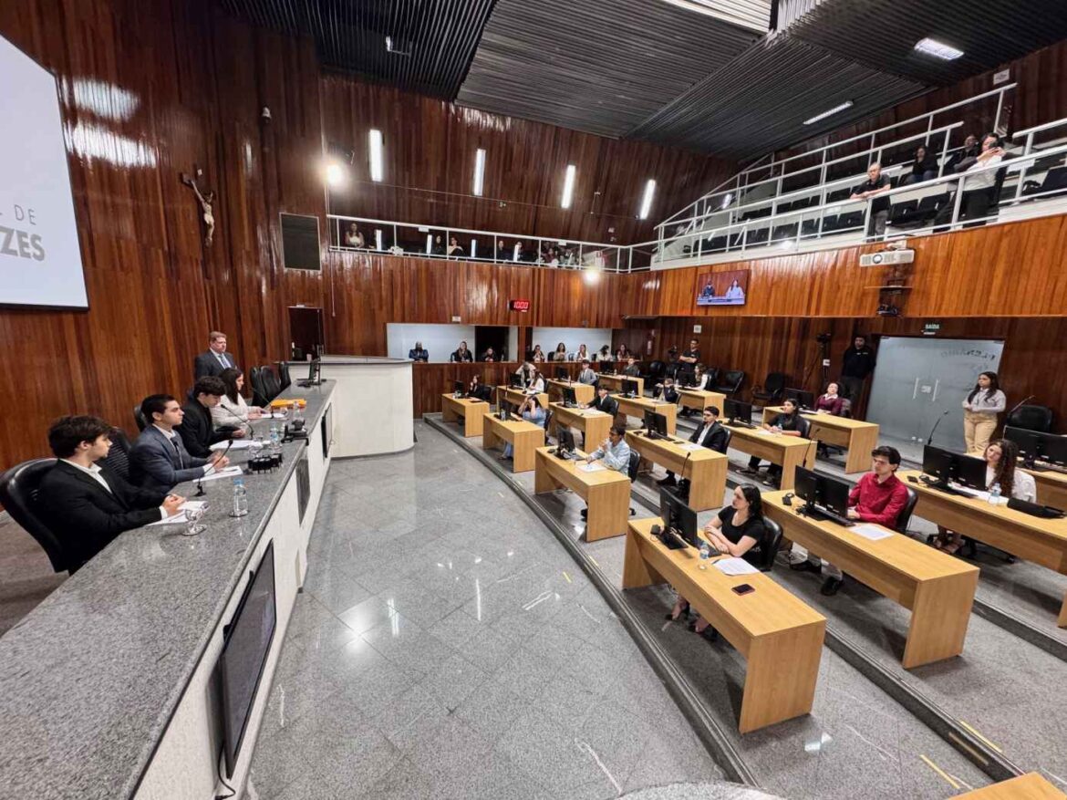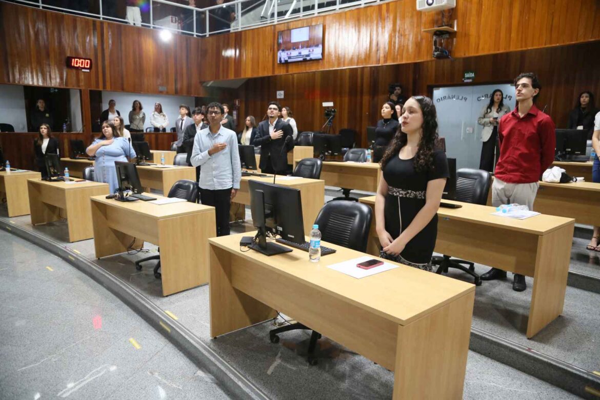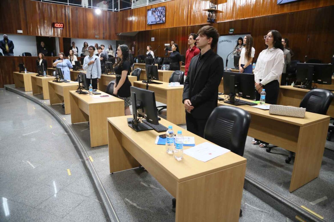 Na manhã desta quinta-feira (14), aconteceu na Câmara Municipal de Mogi das Cruzes a sessão do Parlamento Estudantil, da categoria juvenil. Antes do início da sessão houve a posse da Mesa Diretiva, conduzida pela vereadora Inês Paz, presidente da Comissão Permanente de Educação do Legislativo. A Mesa Diretiva teve a seguinte composição: Lucas Sposi Lemos, do Brasilis (presidente); Nicole Lattaro, do Gutenberg (1ª secretária); Luis Filipe Desencio Palma Navais, do Colégio Dora Peretti de Oliveira (2º secretário); e Gabriel Dalney Vieira Borges, do Colégio Brasilis (1° vice-presidente).