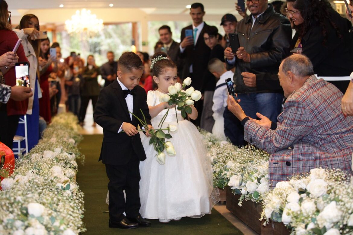 Um quarteto de trompetistas entoou a Marcha Nupcial, de Mendelssohn, dando início à cerimônia comandada pelo juiz de paz Claudinei Camargo. “O tema do Casamento Comunitário deste ano foi ‘O Amor Sempre Prevalece’. Aqui, temos 25 maneiras de evidenciar o amor”, assinalou, ao dizer que o evento reunia casais que que se conheceram há um ano e outros com mais de 50 anos de convivência. Em comum, todos tinham o sonho da cerimônia de casamento. Ao procederem a bênção das alianças, o Pastor Rogério lembrou que “a aliança é um laço sem fim”, enquanto o Padre Osmar cantou uma canção para “consagrar o amor no coração de cada um”.