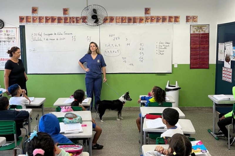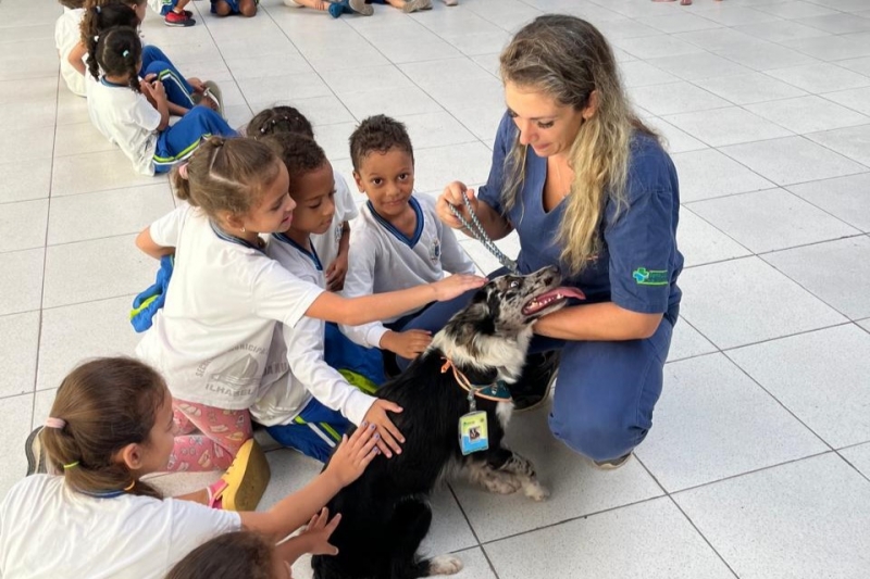 Os alunos da E.M. Pref. Eurípedes da Silva Ferreira, na Barra Velha, receberam uma visita da veterinária Nathalie Vecchio, do Centro de Referência Animal, na última terça-feira (7). Na ação, os pequenos puderam aprender sobre posse responsável e conhecer a terapeuta canina Charlotte.