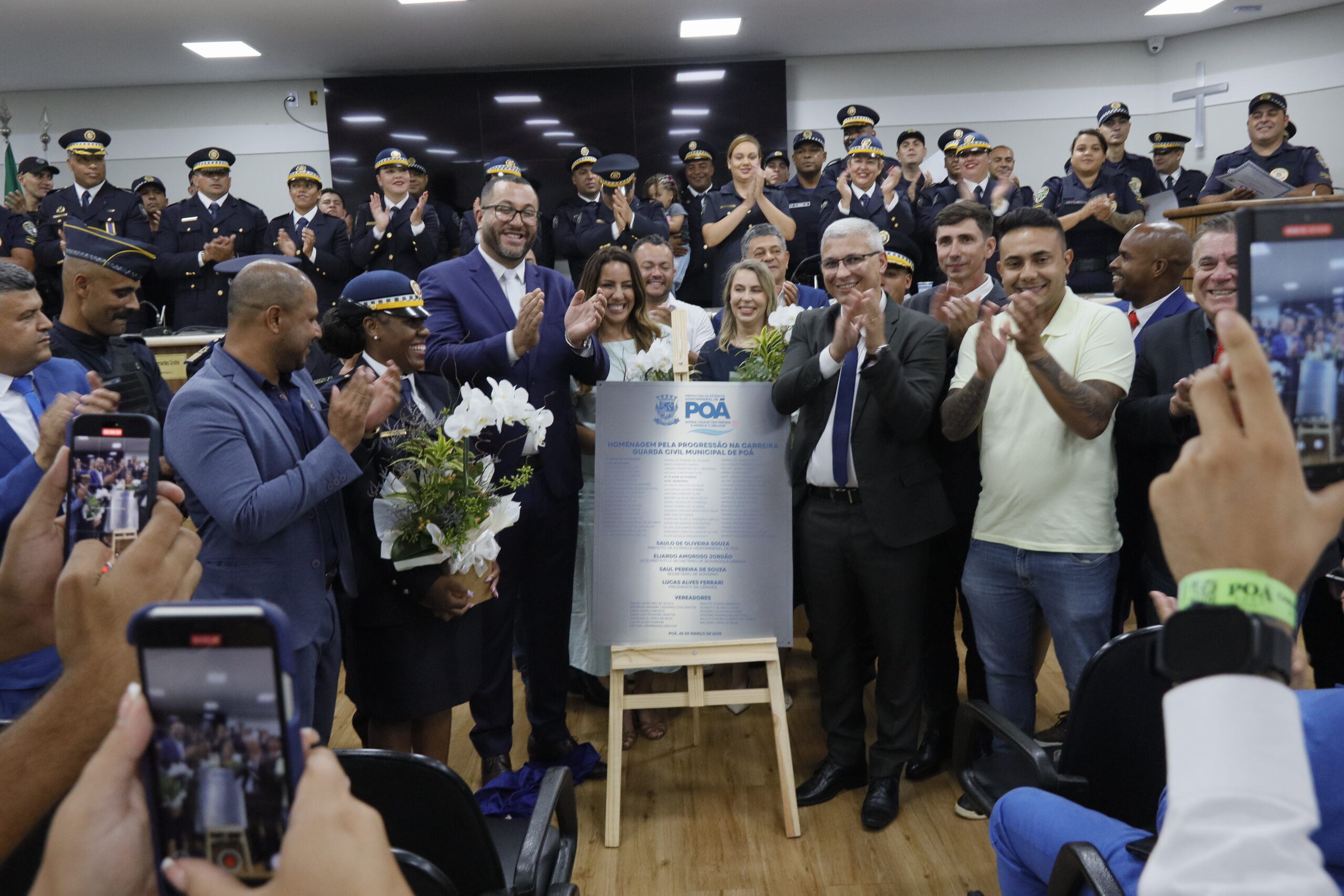 A progressão de carreira de 53 agentes da Guarda Civil Municipal (GCM) de Poá foi oficializada em uma cerimônia realizada no último dia 26, na Câmara Municipal. O evento contou com a entrega de diplomas e tarjetas, além do descerramento de uma placa em homenagem ao efetivo da Polícia Municipal. Após anos de reivindicação, os cargos dos agentes foram finalmente elevados graças a uma iniciativa da gestão do prefeito Saulo Souza, com aprovação unânime dos vereadores.