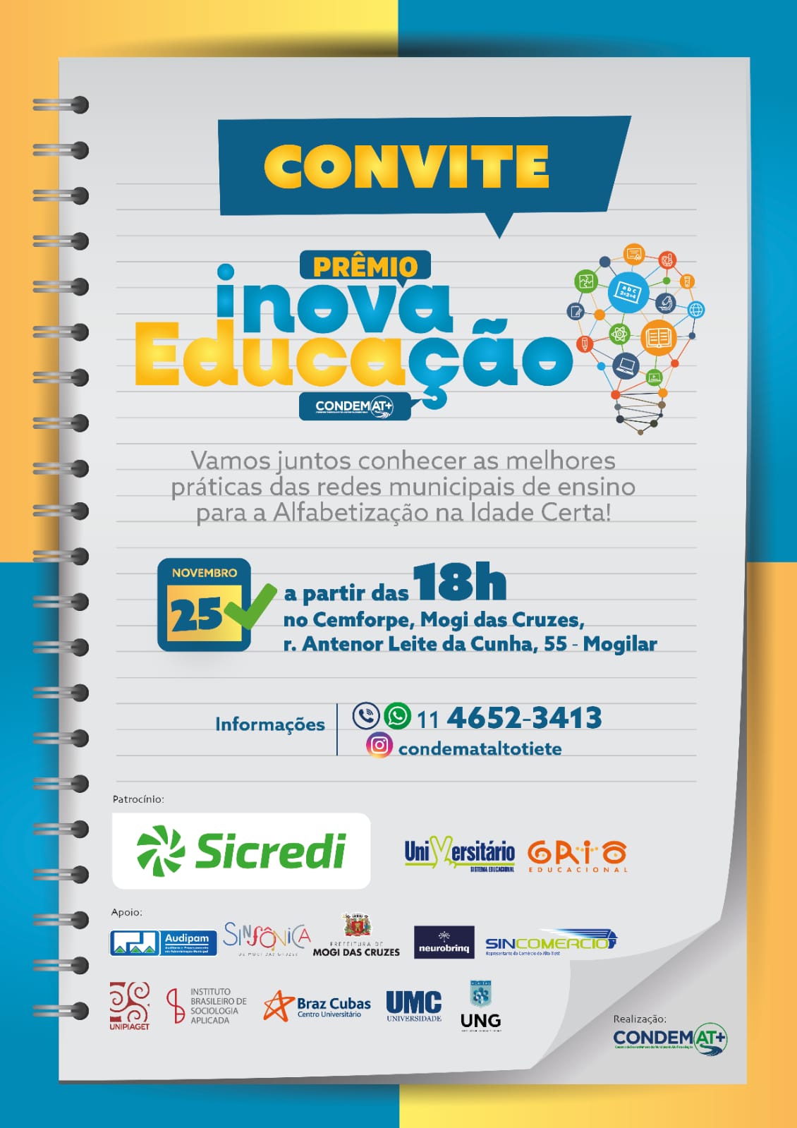 O 1º Inova Educação CONDEMAT+ acontecerá com os apoios de Audipam, Neurobrinq, Sincomércio, Sinfônica de Mogi das Cruzes, Instituto Brasileiro de Sociologia Aplicada (IBSA), Centro Universitário Braz Cubas e Universidades Guarulhos (UNG), Mogi das Cruzes (UMC) e Piaget (UniPiaget). Acesse o link https://forms.gle/Yha9a44VgNPgfMW46 para inscrições ou ligue no (11) 4652-3413.
