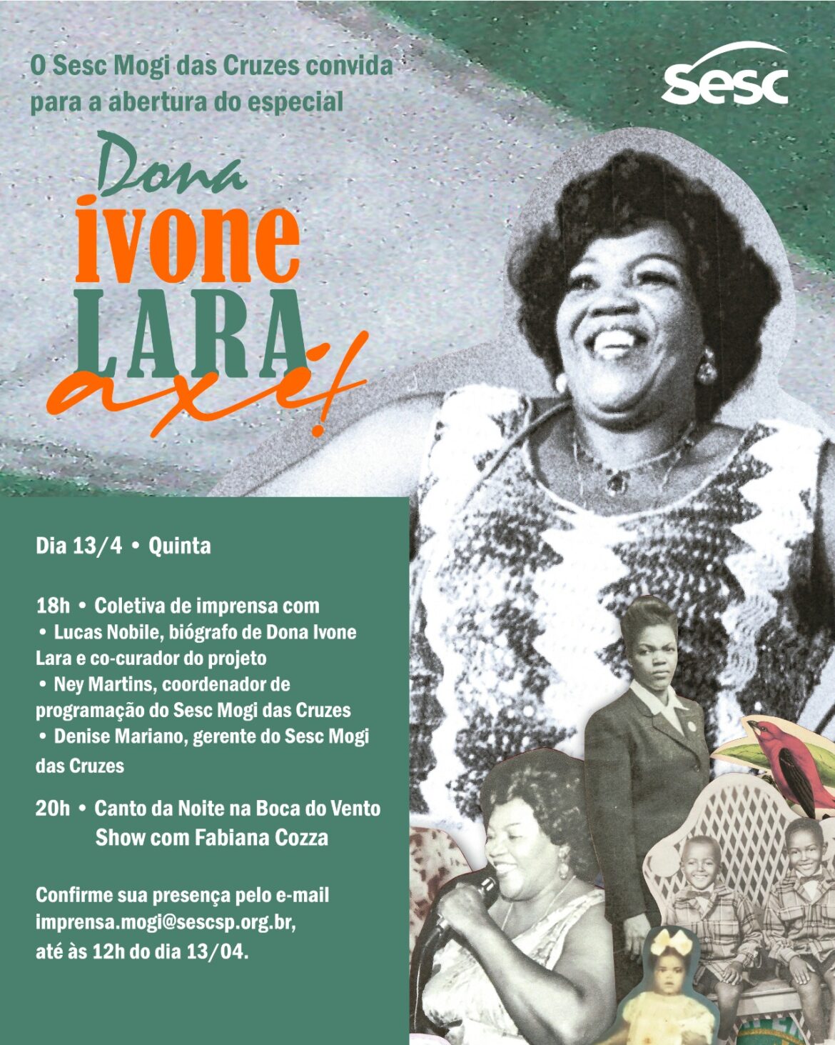 O projeto Dona Ivone Lara: Axé!, marca o encerramento dos festejos do centenário de nascimento de uma das figuras mais representativas da história do samba. A partir de 13 de abril, data em que Dona Ivone completaria 101 anos, o Sesc Mogi das Cruzes apresenta show, ações formativas e outras atividades das mais diferentes áreas e para todas as idades, tendo como norte a obra e a trajetória de Dona Ivone.