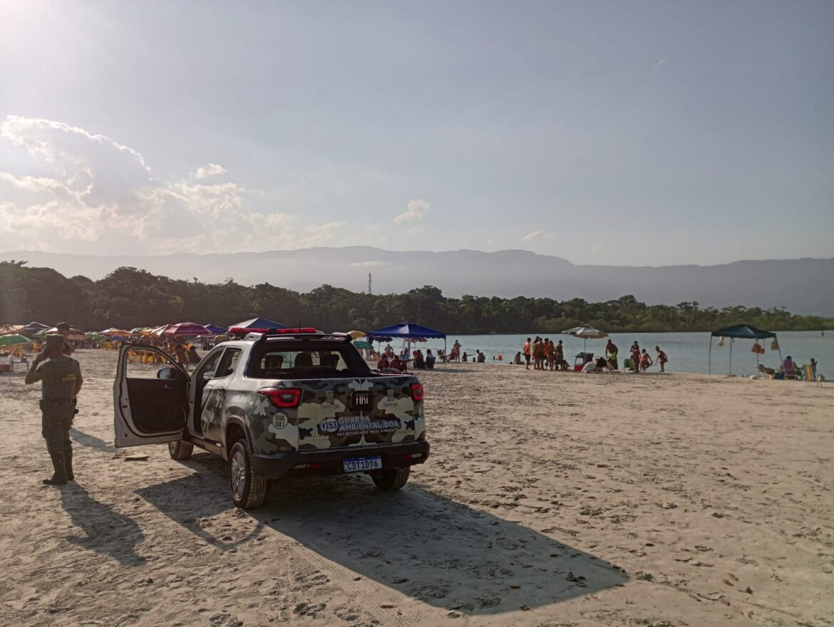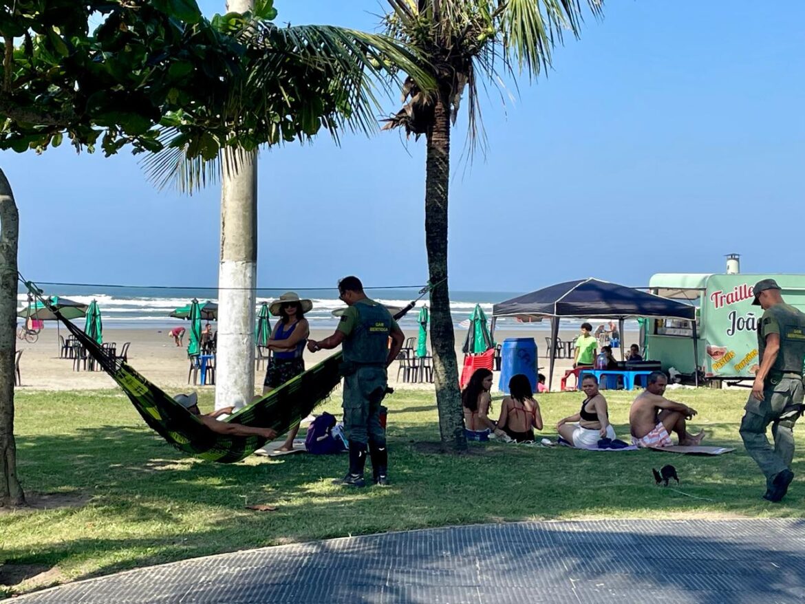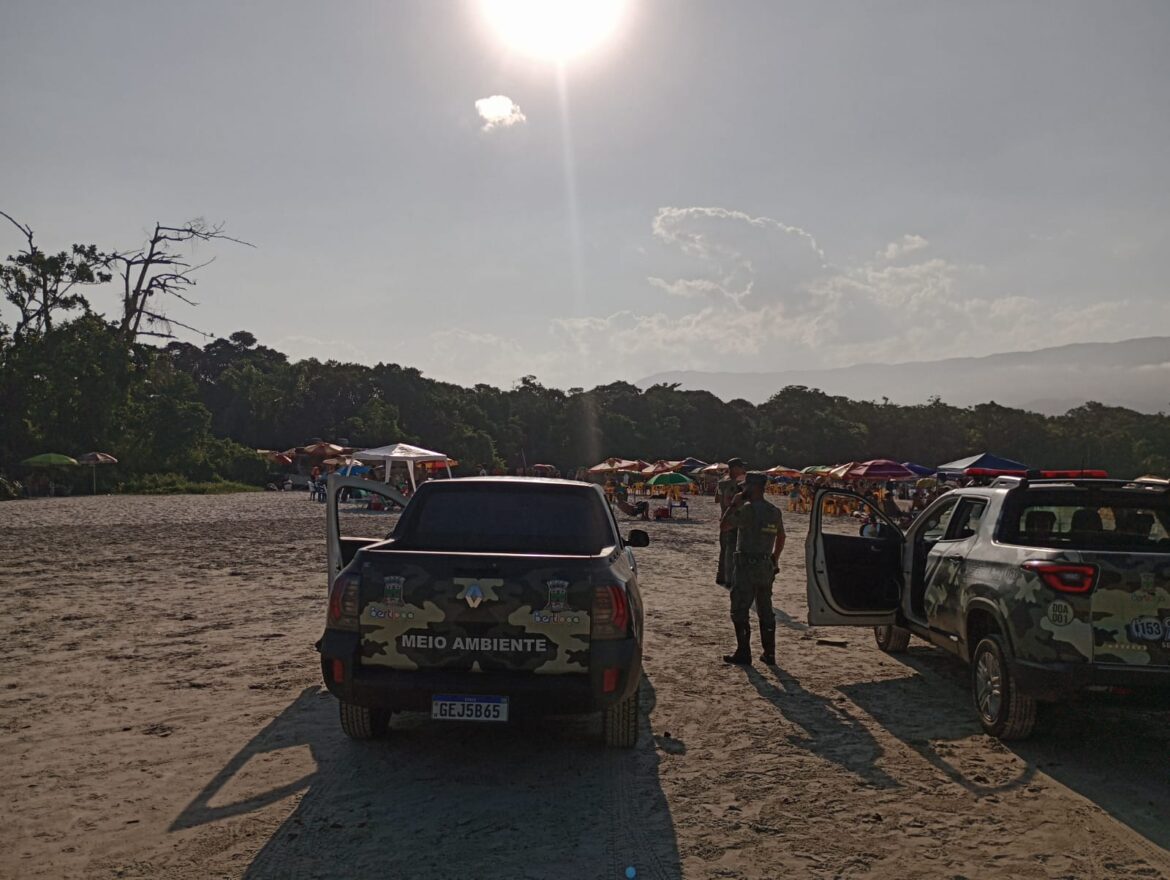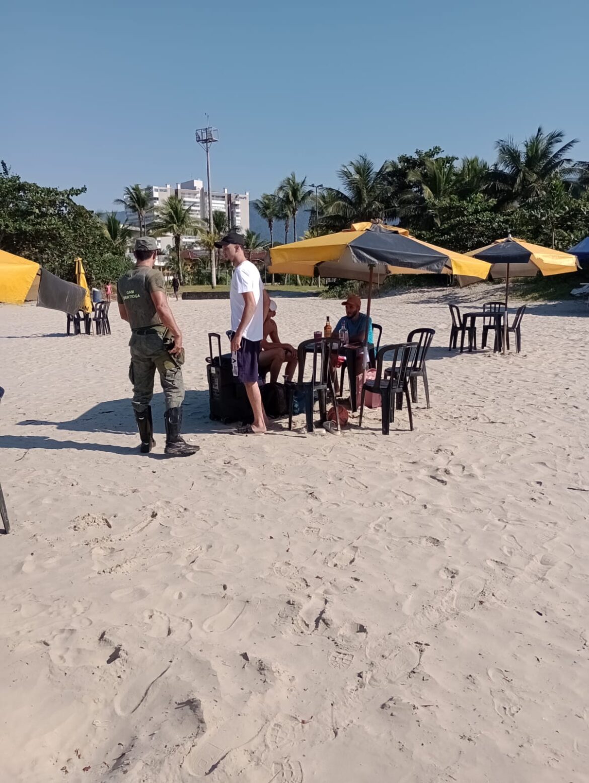 Durante a patrulha na orla da praia, que ocorre do Centro a Boraceia, foram realizadas orientações para a retirada de rede na orla da praia em Vista Linda, bem como de uma churrasqueira na faixa de areia da praia Enseada no Maetinga.