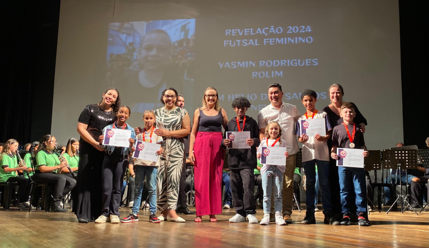 Valenttina do Prado, aluna da EM Prof. Adolfo Martini, foi uma das seis estrelas do Futsal que receberam o prêmio de destaque “Defesa Menos Vazada” na categoria de esporte coletivo.”É uma emoção muito grande chegar aqui, e ainda por cima como destaque! Isso me inspira a continuar buscando novos desafios”, declarou ela. A secretária de Educação, acompanhada da secretária adjunta, Mariane Prestes, e do vereador Eduardo Ota, entregou as medalhas aos alunos destaques.