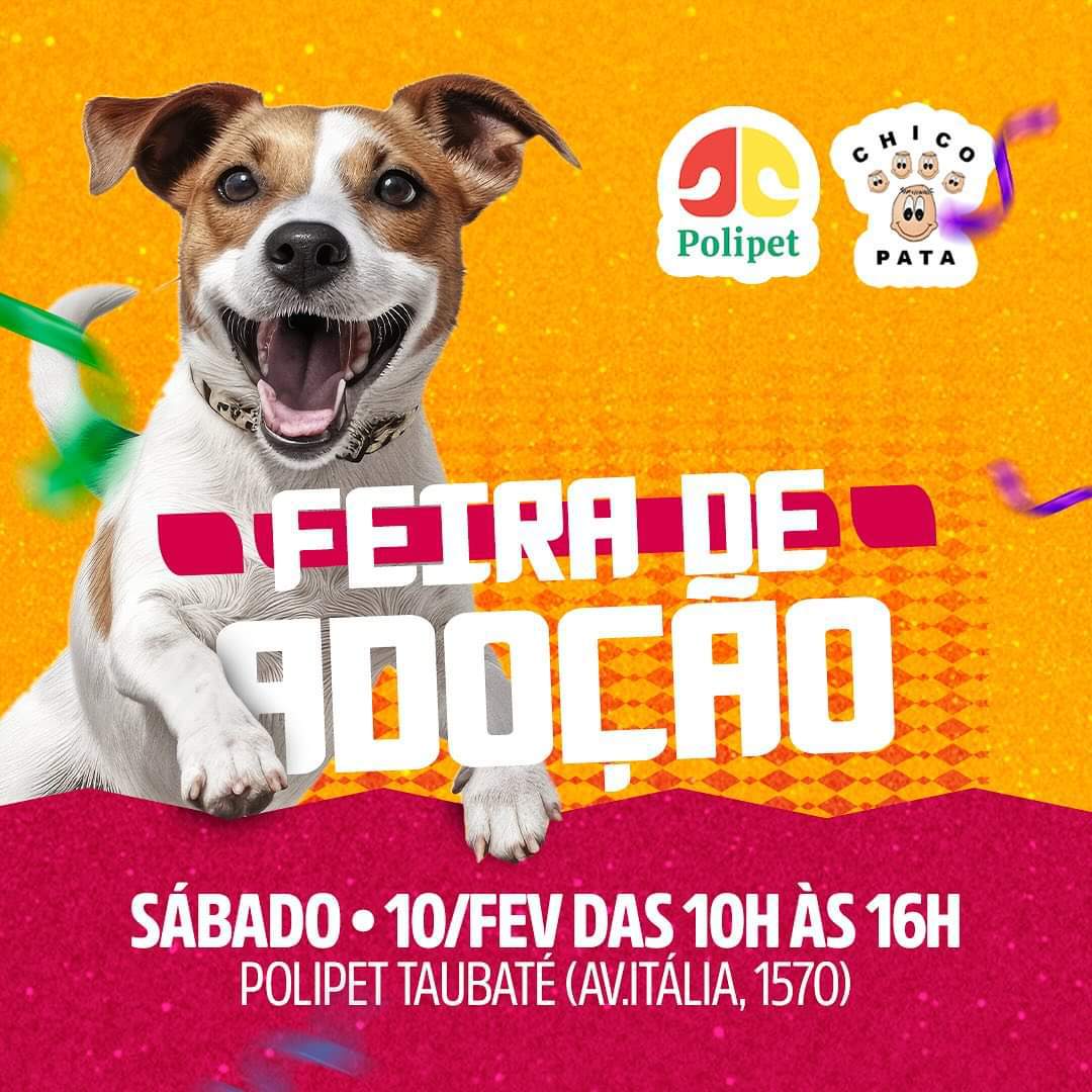 A ONG Chico Pata, em parceria com a Prefeitura de Taubaté, irá realizar feira de adoção de cães e gatos, que são abrigados pelo CCZ (Centro de Controle de Zoonoses), na Poli Pet, no sábado, dia 10, das 10h às 16h.