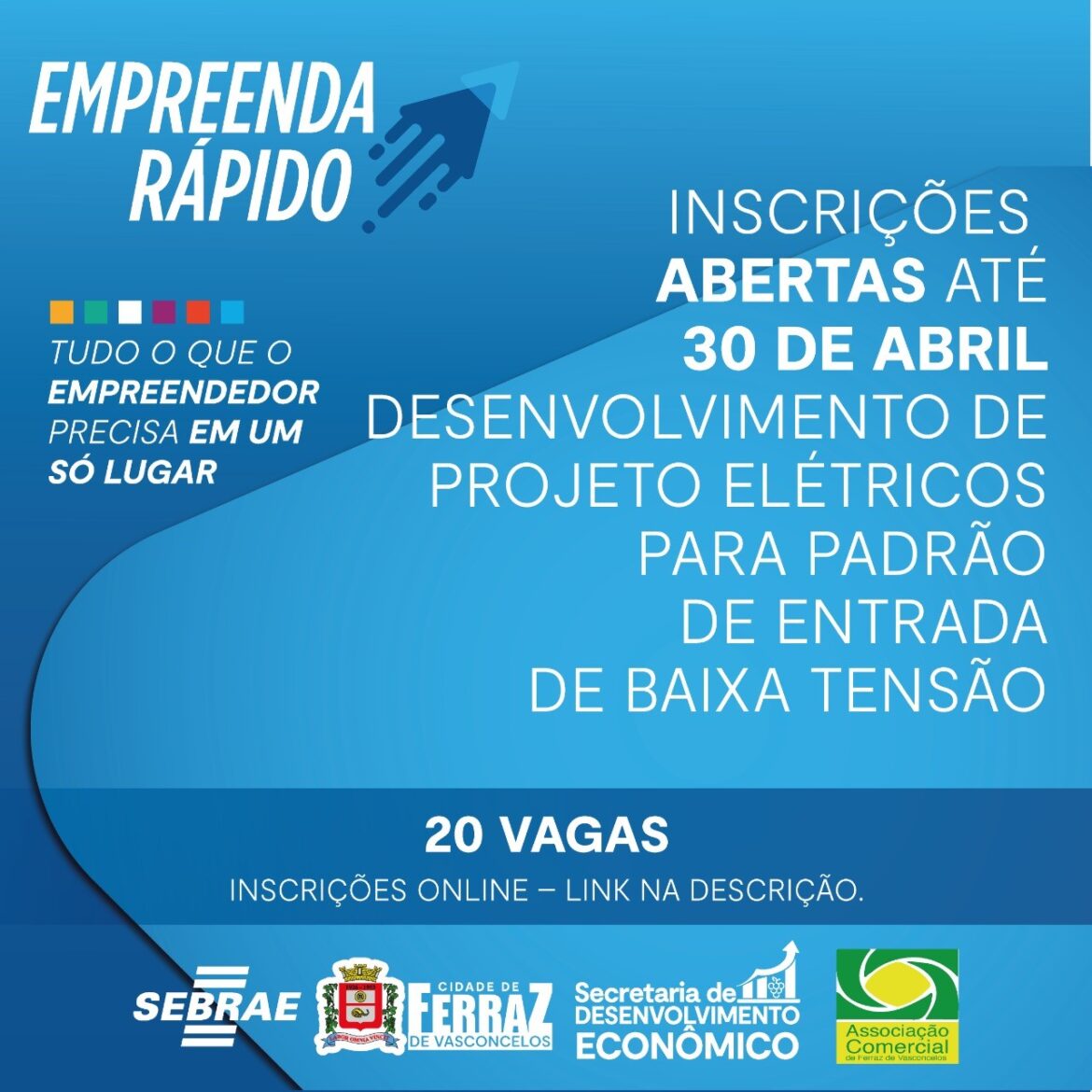 Mais uma oportunidade de qualificação para os moradores de Ferraz de Vasconcelos. A Secretaria Municipal de Desenvolvimento Econômico, por meio do programa Empreenda Rápido, está com inscrições abertas para o curso de “Desenvolvimento de Projeto Elétricos para Padrão de Entrada de Baixa Tensão”. O cadastro pode ser realizado até sexta-feira (30) de forma online e há 20 vagas disponíveis.