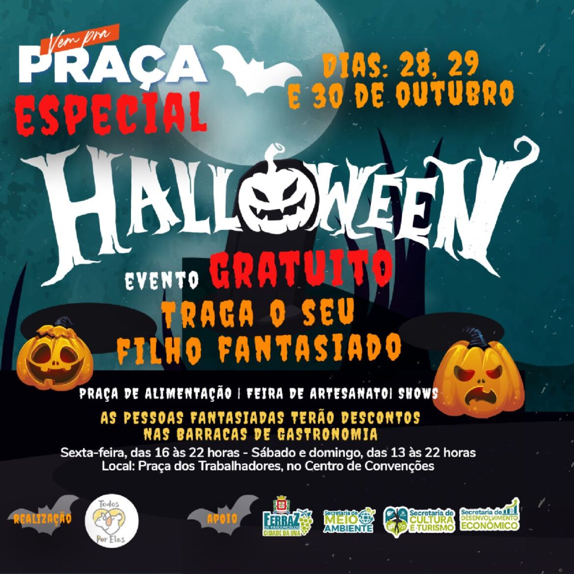 A Prefeitura de Ferraz de Vasconcelos, por meio da Secretaria de Cultura e Turismo, promoverá neste final de semana, de 28 a 30 de outubro, o Vem Pra Praça Especial de Halloween na Praça dos Trabalhadores, no Centro de Convenções, com entrada gratuita e livre para todos os públicos.Dentro da programação ofertada, haverá shows, Praça de Alimentação, Espaço Kids, área PET, apresentação de Cosplay e fantasias. Vale salientar que os pais ou responsáveis poderão levar os filhos fantasiados para uma maior diversão do evento.