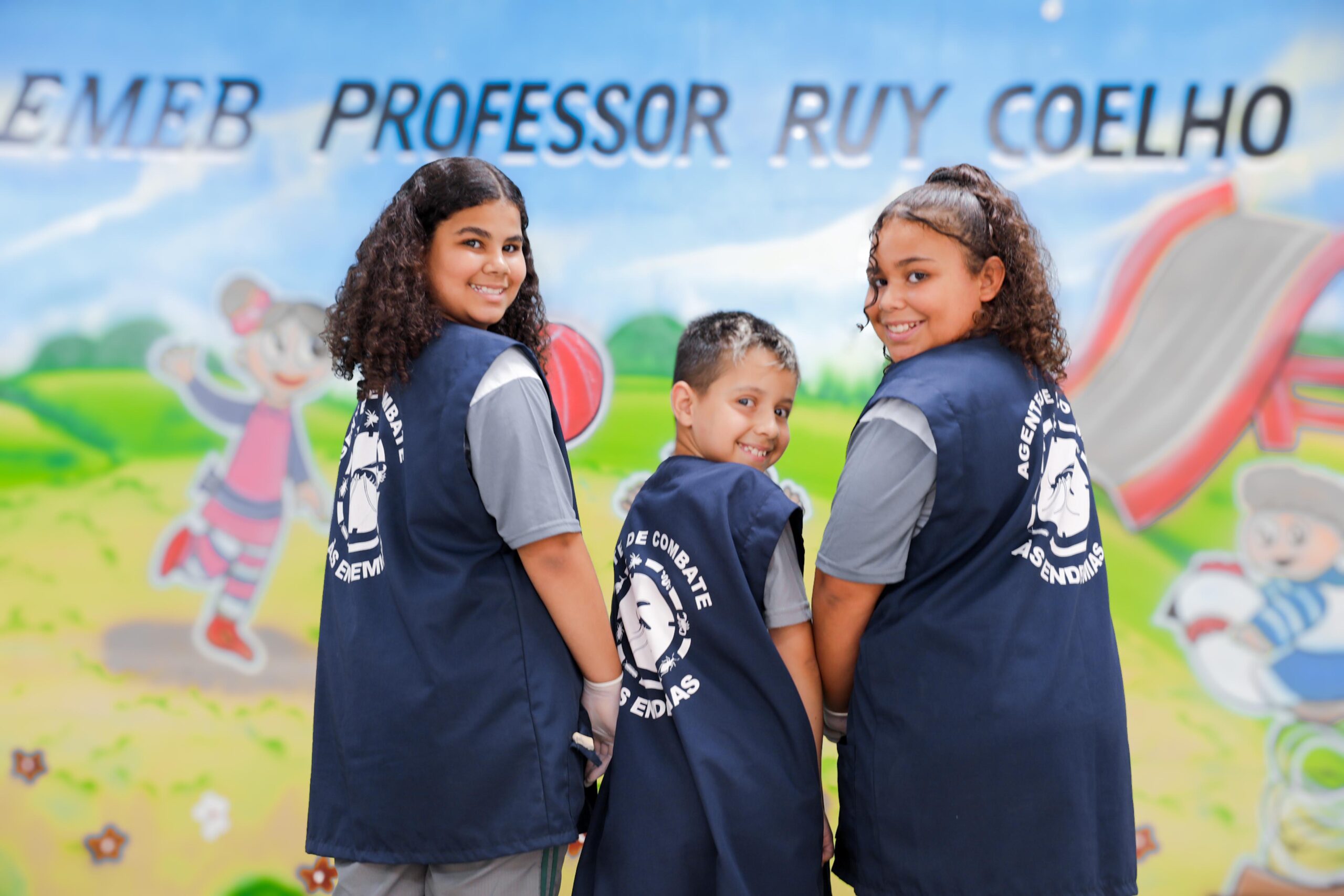 Três alunos da Ruy Coelho: Maria Eduarda, Miguel e a segunda aluna, a Maria Eduarda são os agentes de combate à dengue representando todos os alunos das escolas do município.