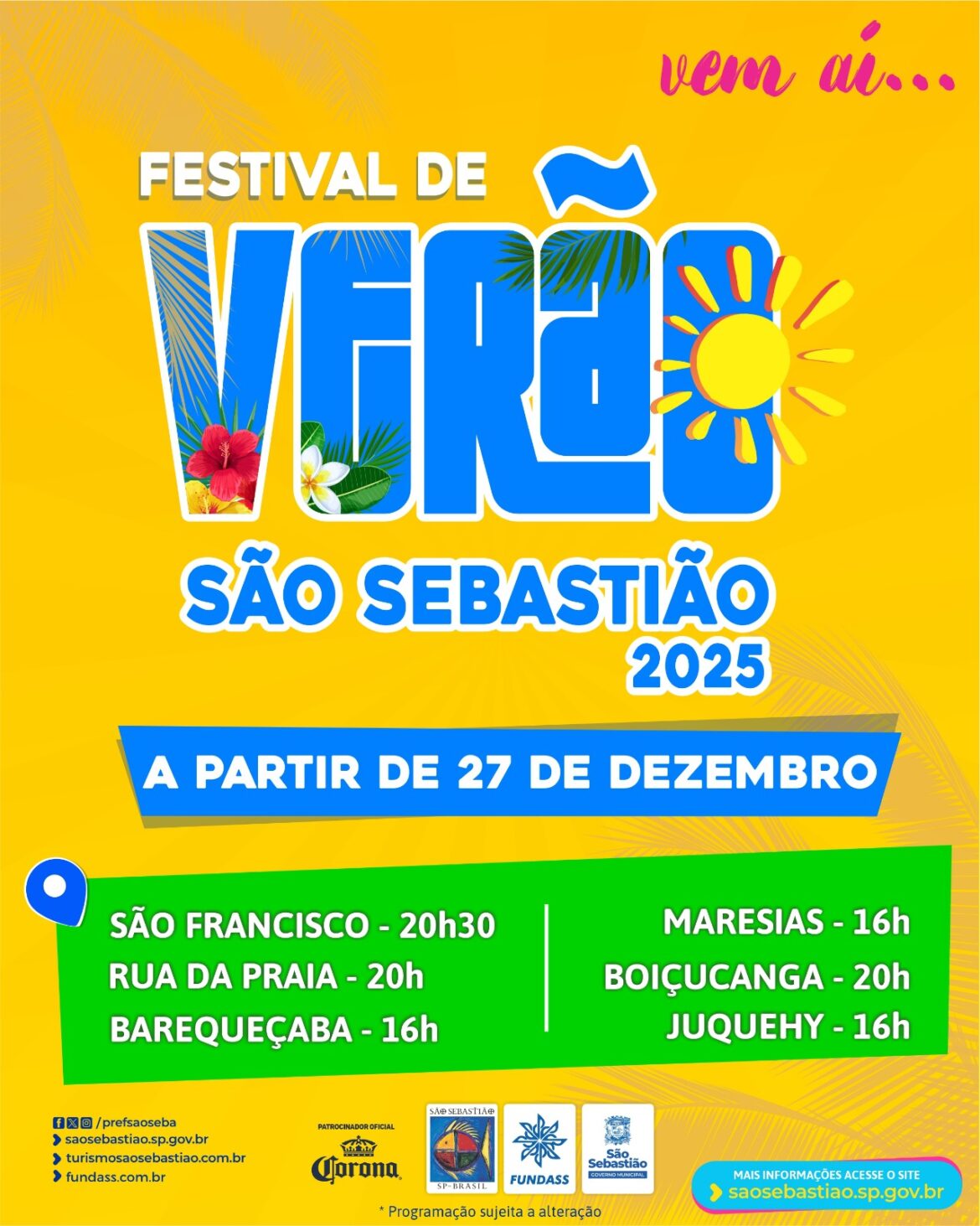 Valorizando os artistas e as bandas locais, a partir do dia 27 de dezembro, a Prefeitura de São Sebastião, por meio da Secretaria de Turismo (SETUR) e da Fundação Educacional e Cultural ‘Deodato Sant’Anna’ (Fundass), com patrocínio da Corona, dá início ao Festival de Verão de São Sebastião 2025.