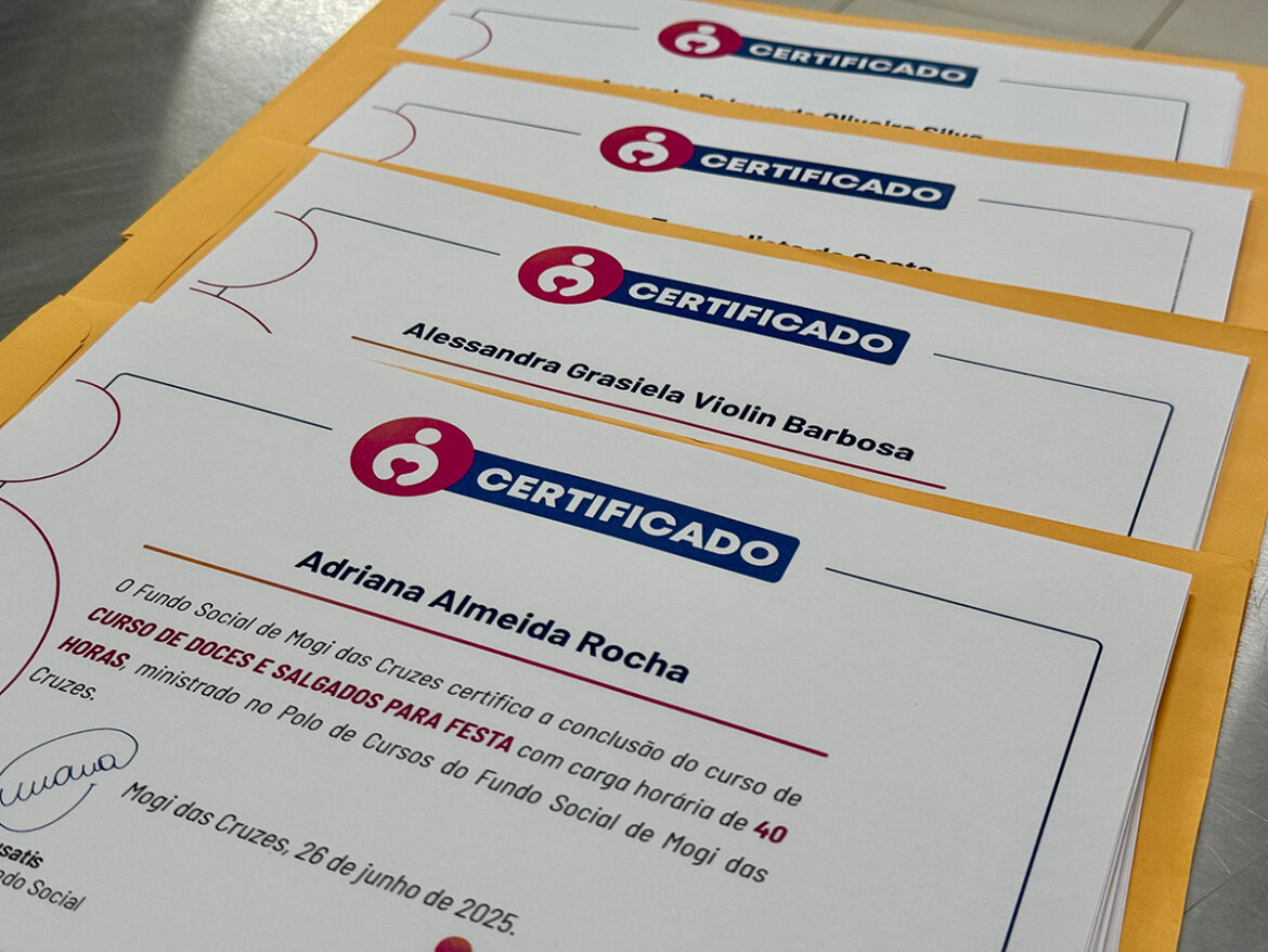 A presidente do Fundo Social de Mogi das Cruzes, Maira Cusatis, entregou nesta quinta-feira (03/07) os certificados aos formandos dos cursos de capacitação profissional e geração de renda. Ao todo, 175 alunos concluíram as aulas da segunda turma deste ano, iniciadas em maio, no Polo da Vila Brasileira e nos polos descentralizados de Cezar de Souza e do Conjunto Jefferson da Silva. Em breve serão abertas inscrições para novas turmas em várias modalidades.