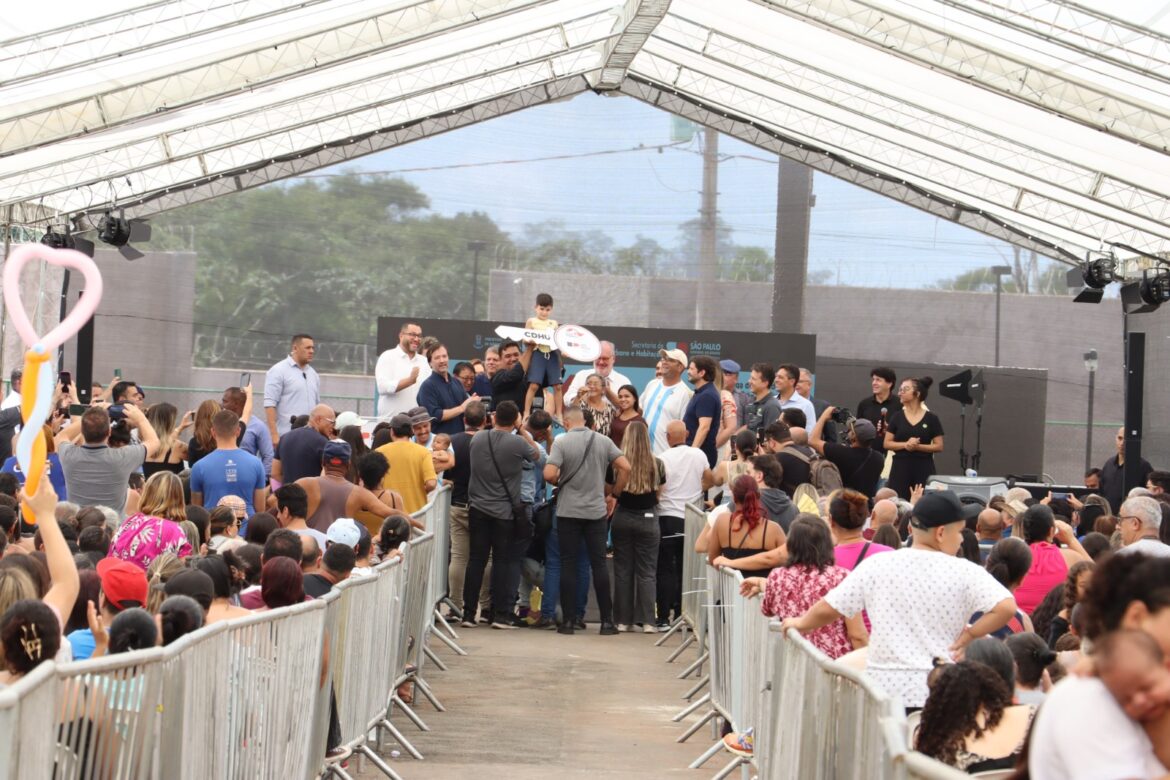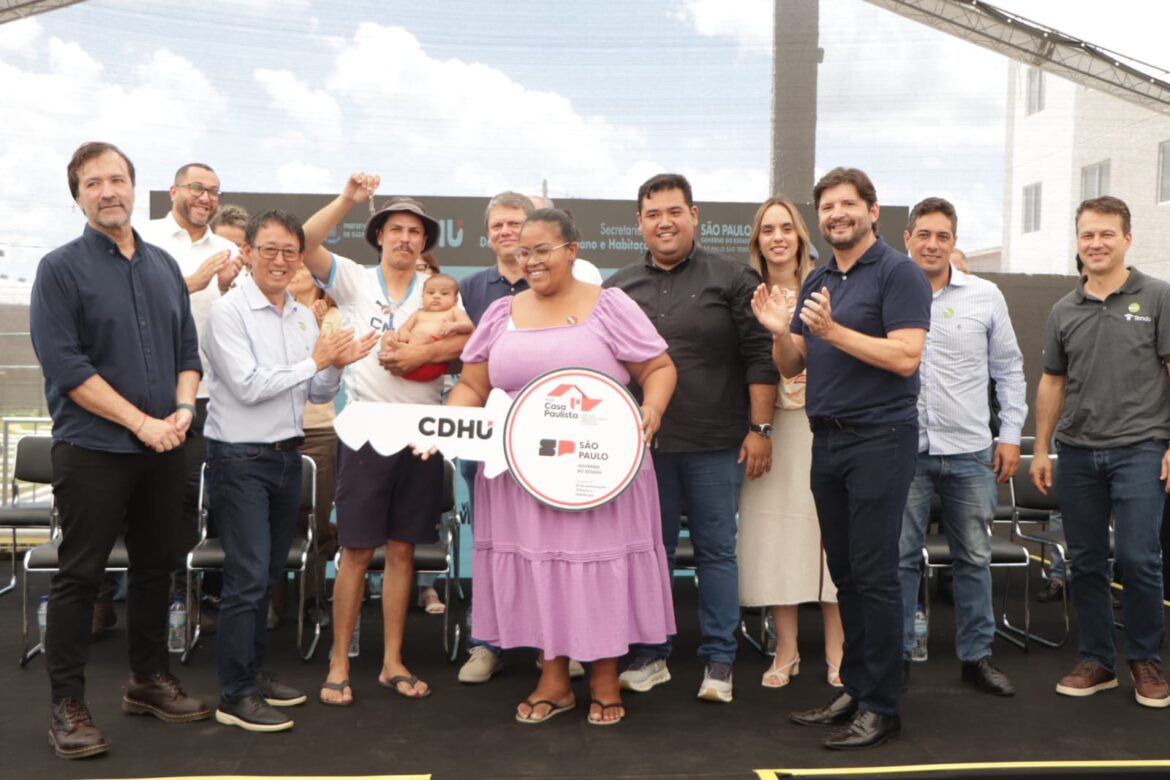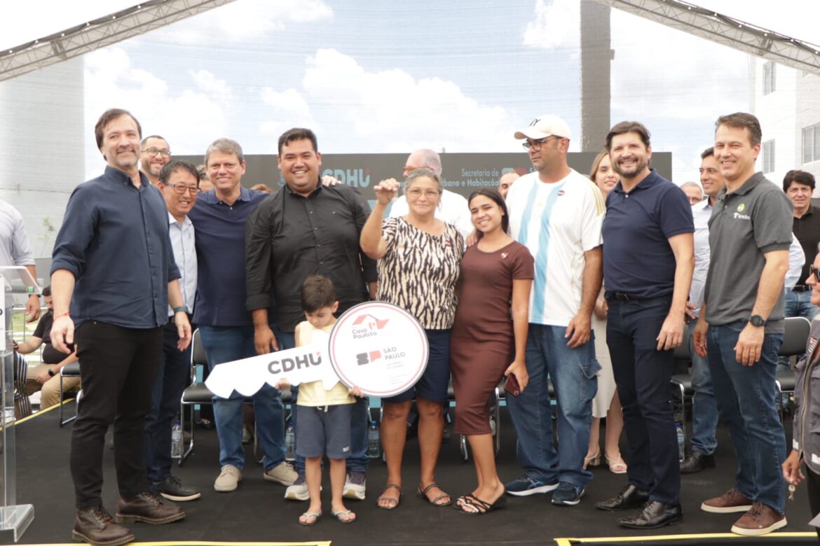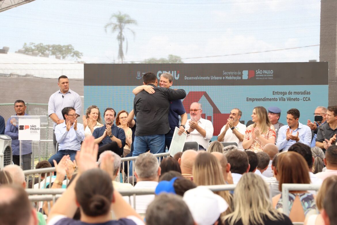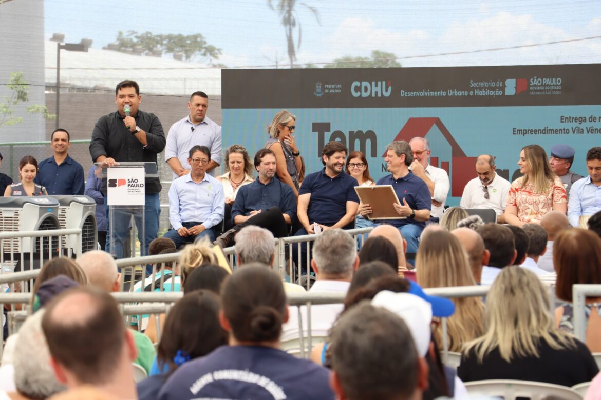 Em cerimônia marcada por muita alegria e emoção, a Prefeitura de Suzano e o governo do Estado entregaram, nesta quarta-feira (26), 416 apartamentos do Residencial Villa Veneto, localizado na rua Mitsuharu Matsushita, 324, no bairro Chácara Estância Paulista. A cerimônia contou com as presenças do governador Tarcísio de Freitas; do prefeito Pedro Ishi; do secretário de Estado de Desenvolvimento Urbano e Habitação, Marcelo Branco; e de outras autoridades municipais e estaduais.