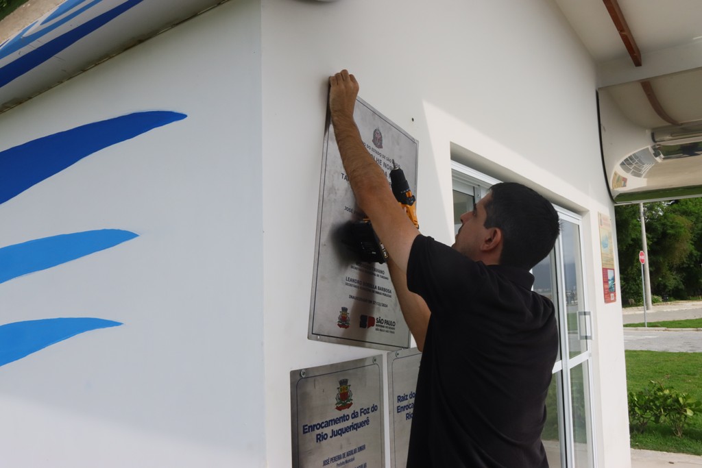 Após o ofício do Dadetur, um servidor da Secretaria de Obras Públicas desparafusou a placa inaugural referente ao Governo do Estado de São Paulo afixada no monumento “Balsa de Canoas” nesta terça-feira (28/1), no Porto Novo.