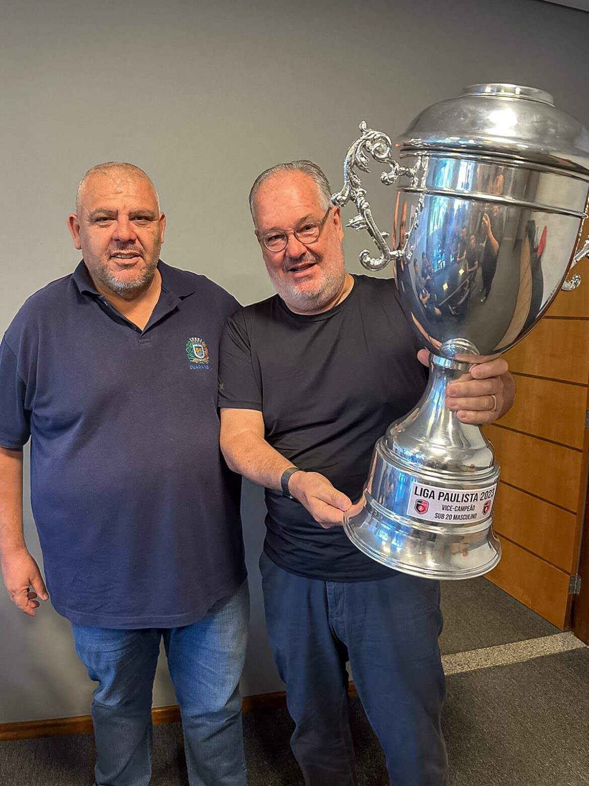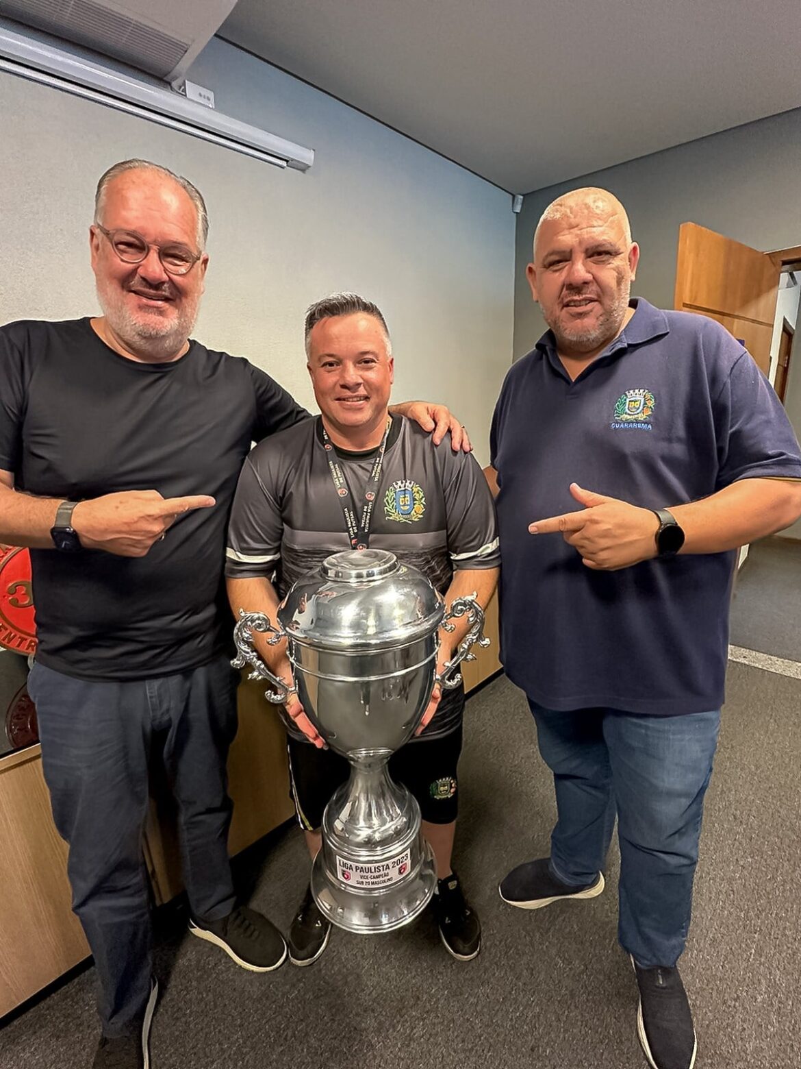 “Parabenizo a todos pelo título. Vocês jogaram com muita garra, técnica e estratégia, e mereceram este reconhecimento”, disse o prefeito Zé, ao lado do secretário municipal de Esportes e Lazer, Sidnei Leal, e do técnico Juliano Martins, o Jabá.