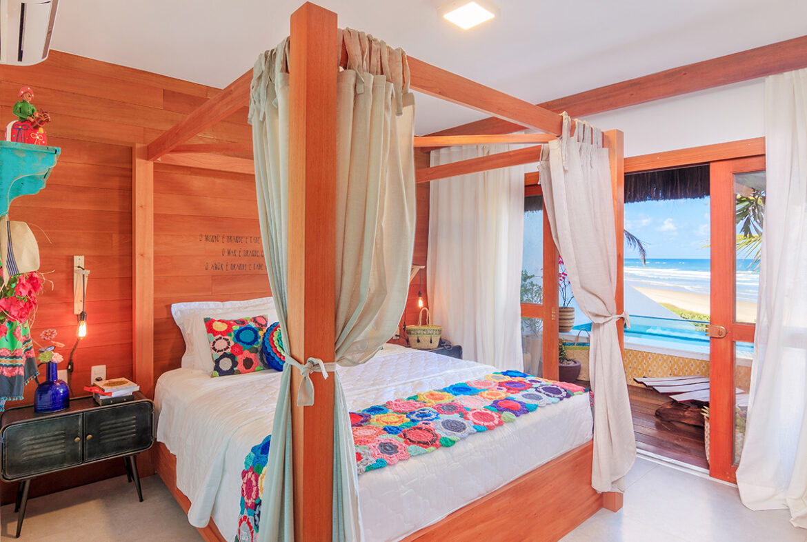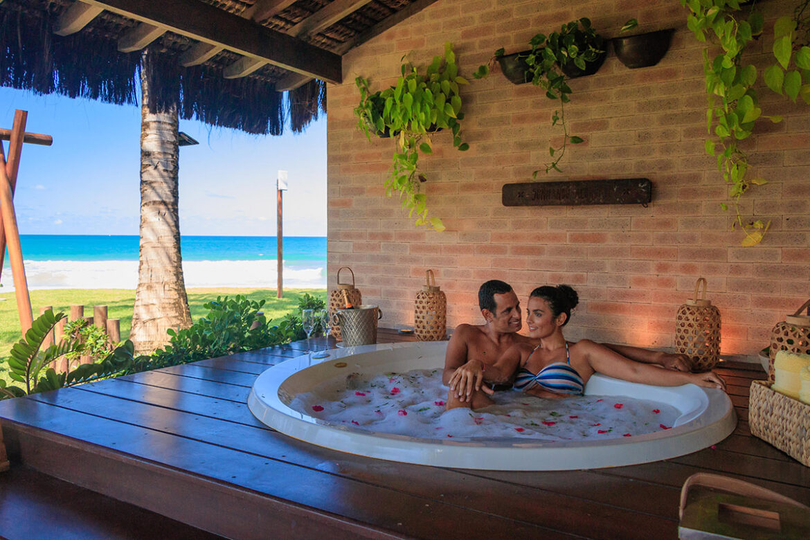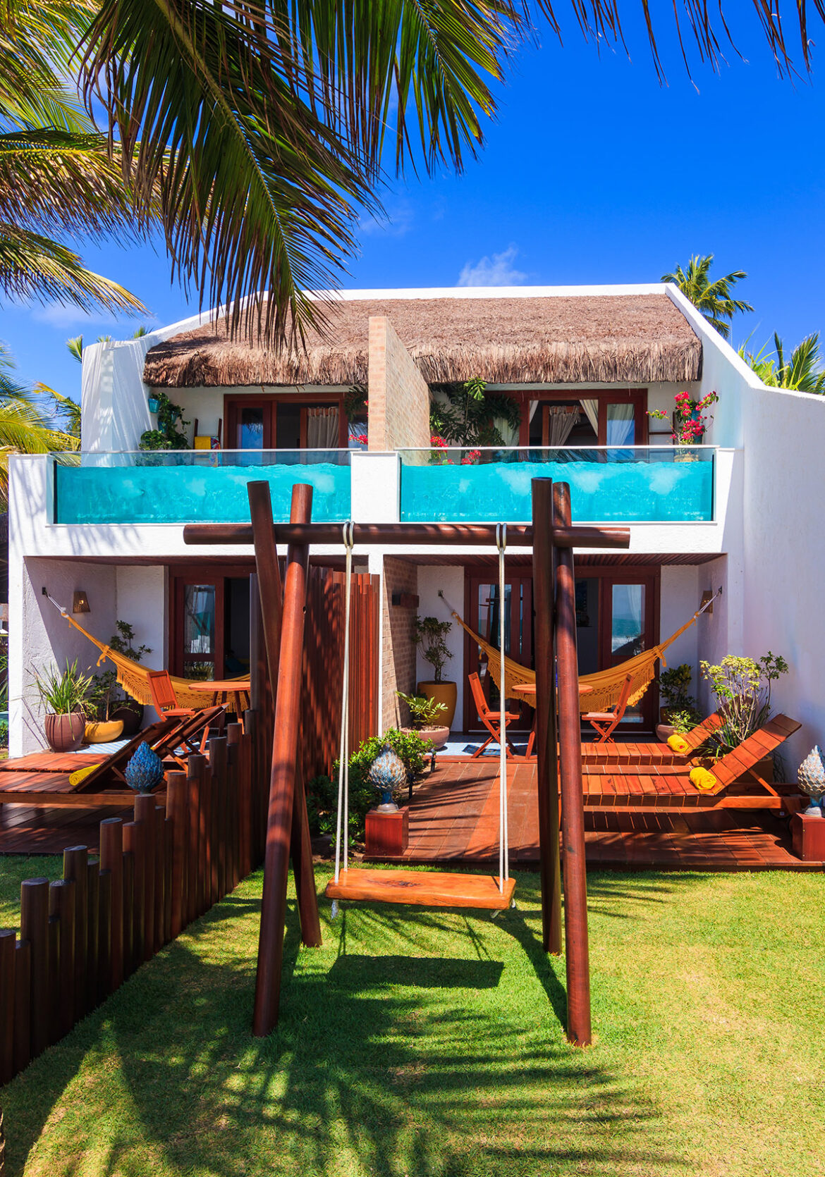 • E para uma experiência ainda mais sofisticada, os bangalôs super luxo também de frente para a praia, possuem dois andares: sala no térreo e quarto no andar superior, que conta com uma piscina exclusiva na varanda com vista privilegiada para o oceano.