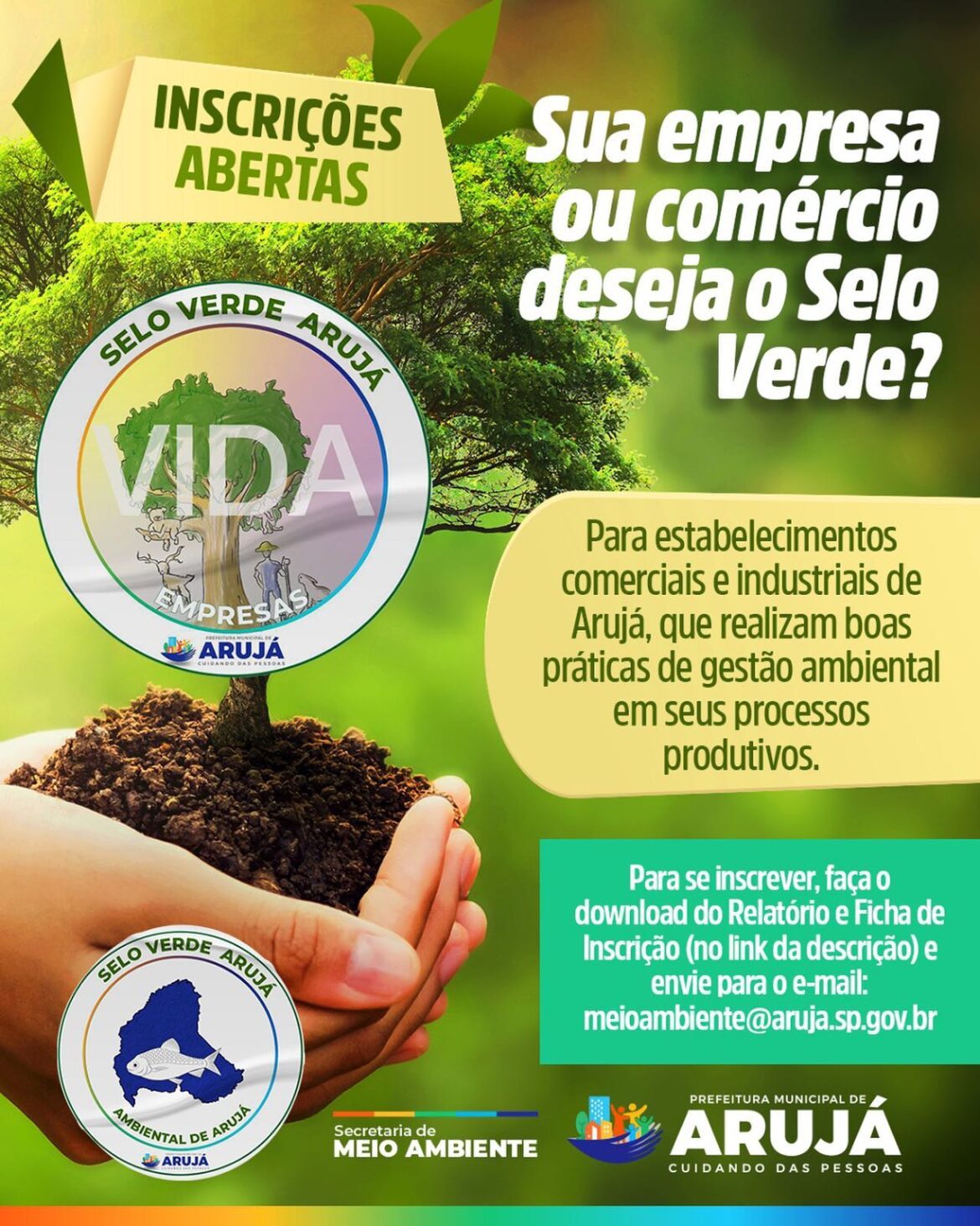 A Prefeitura de Arujá, pela Secretaria Municipal de Meio Ambiente, lançou por meio do Decreto nº 8.054, de23 de agosto de 2022, o Selo Verde Ambiental, para empresas. Esta é uma forma de certificação ambiental cedida a estabelecimentos comerciais e industriais de Arujá, que realizaram boas práticas de gestão ambiental em seus processos produtivos. A ação conta com a parceria do Conselho Municipal de Meio Ambiente (Condema) e da Câmara Municipal.As inscrições estão abertas e, para se inscrever, é necessário encaminhar Relatório e Ficha de Inscrição (constante no Anexo I do Decreto) ao e-mail: meioambiente@aruja.sp.gov.br.As empresas que cumprirem cinco dos dez critérios de avaliação indicados no Decreto terão o direito de usar, publicamente, o selo junto de suas marcas pelo prazo de 2 anos, tanto como forma de reconhecimento, por parte do Poder Público, por conta das boas iniciativas ambientais que a empresa pratica, quanto como peça de publicidade do envolvimento da indústria ou comércio com a causa e a ação do meio ambiente.
