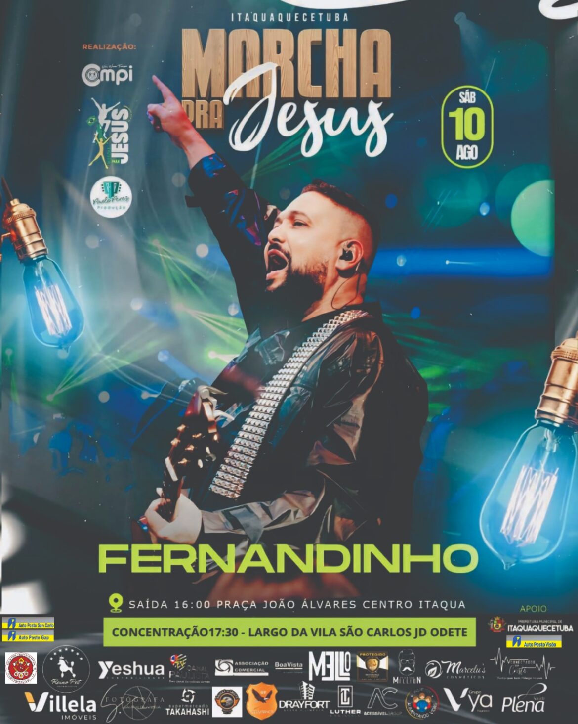 No próximo sábado, 10 de agosto de 2024, Itaquaquecetuba sediará a “Marcha para Jesus”. A concentração terá início às 16h na Praça Padre João Álvares, com encerramento no Largo da Vila São Carlos, onde ocorrerá um show do cantor gospel Fernandinho (Fernando Jerônimo dos Santos Júnior). Fernandinho é conhecido por sua música cristã contemporânea e é pastor da Igreja Mananciais, no Rio de Janeiro.
