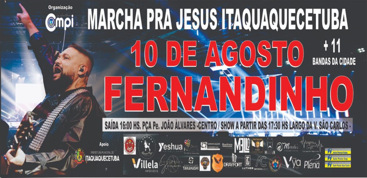 No próximo dia 10 de agosto de 2024 (Sábado) acontecerá em Itaquaquecetuba a “ MARCHA PARA JESUS”, que terá sua concentração na Praça Padre João Alvares as 16h com encerramento no Largo da Vila São Carlos com Show do Cantor Gospel Fernandinho, (Fernando Jerônimo dos Santos Júnior, conhecido popularmente como Fernandinho, é um cantor brasileiro de música cristã contemporânea, compositor e pastor evangélico. É membro da Igreja Mananciais, na Barra da Tijuca, Rio de Janeiro.
