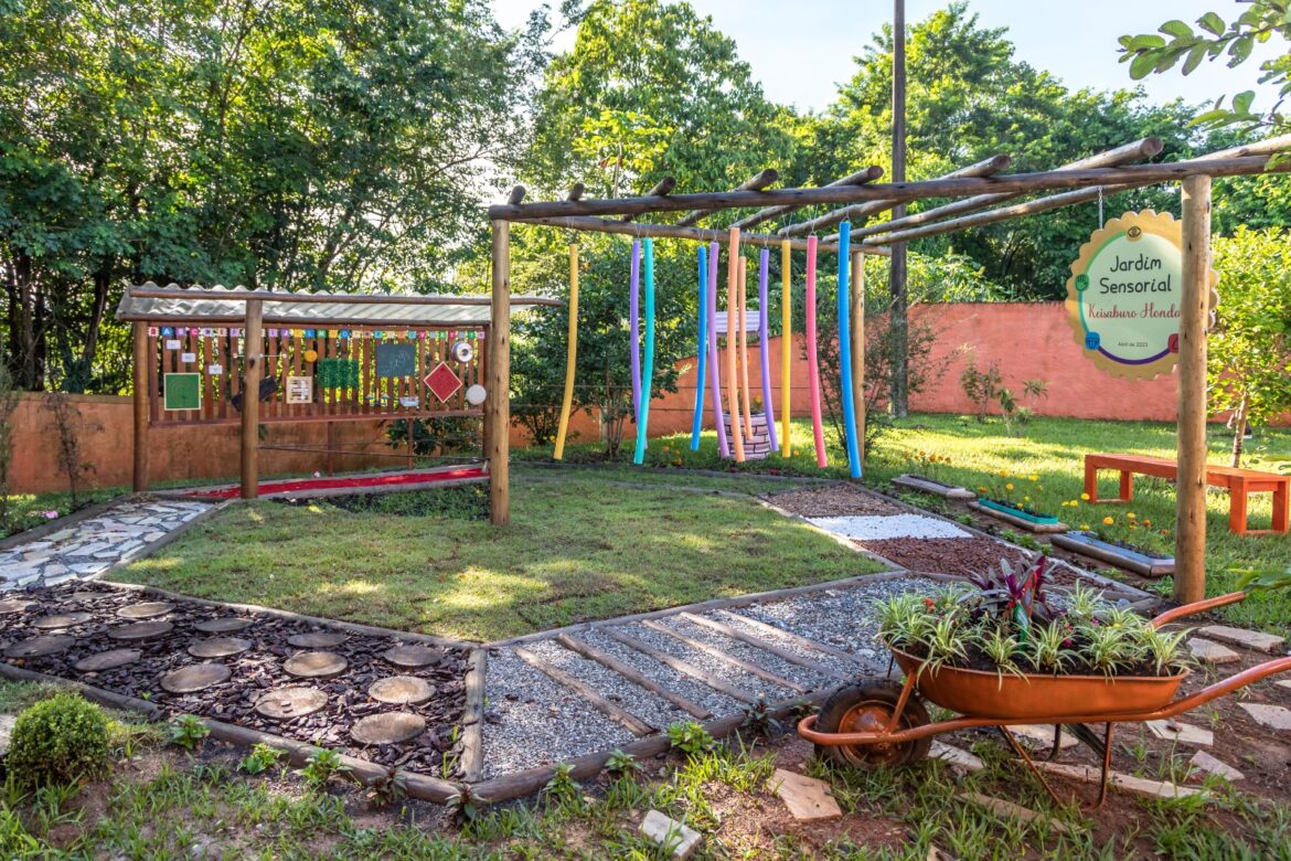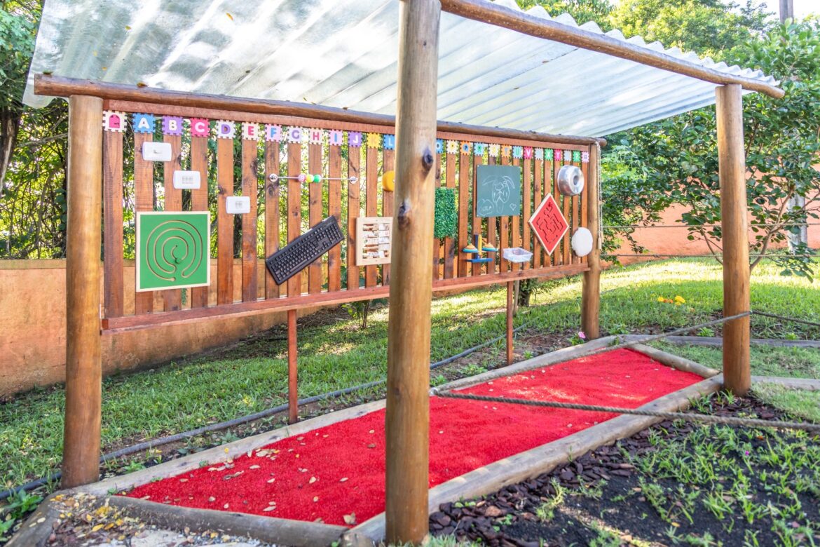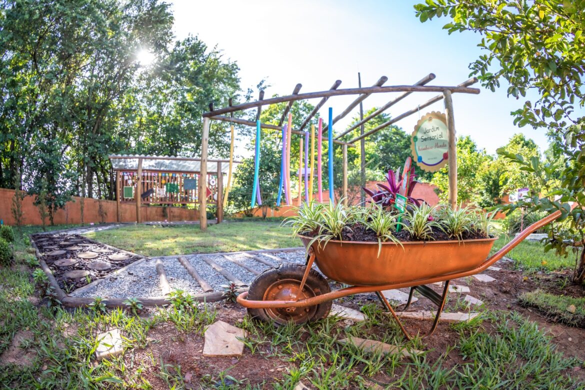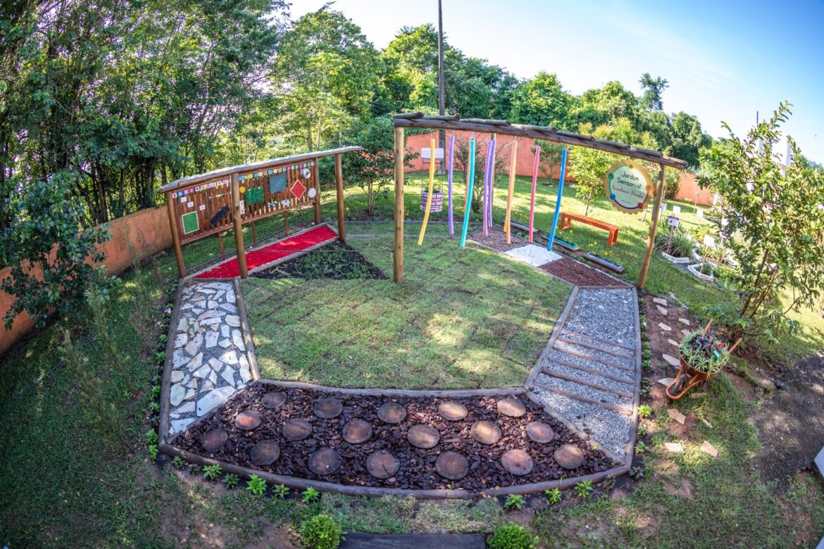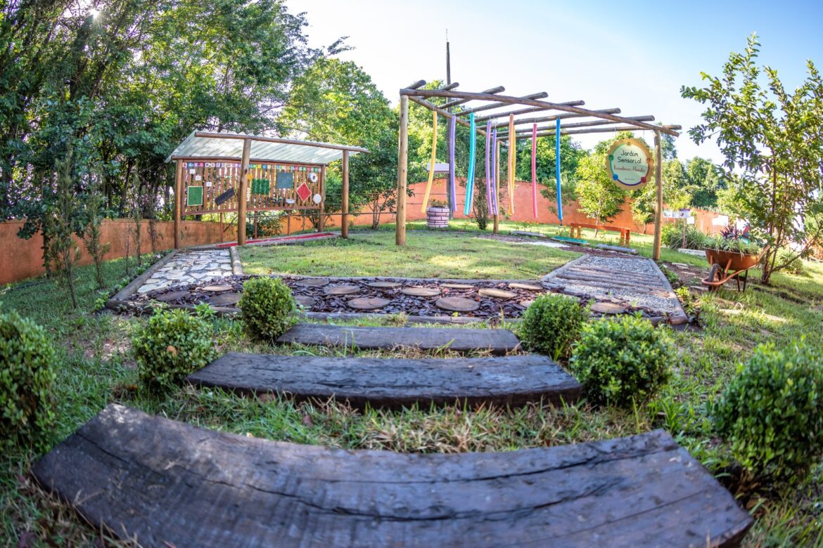 Localizado ao lado da horta da escola, o Jardim Sensorial conta com diferentes tipos de piso, como cascalho, pedras e argila expandida, para que os alunos sintam, até mesmo nos pés, diferentes tipos de estímulos, como a percepção do corpo no espaço.