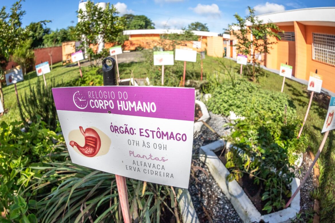 E não é só isso: o centro do jardim funciona como um projeto inédito na Rede Municipal de Ensino de Guararema, o Relógio do Corpo Humano, inspirado na cultura chinesa, que apresenta o conceito que as plantas desempenham funções benéficas em órgãos específicos.