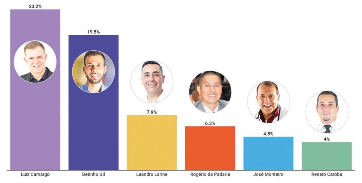 No cenário estimulado, o advogado Luís Camargo (PSD), que somou 23,2% intenção de, divide a liderança com o empresário Betinho Gil, (Podemos) que obteve 19,5% de preferência dos arujaenses; tecnicamente empatados, eles mantêm ampla distância do também pré-candidato Leandro Larini (PSDB), que somou 7,9% e terminou a pesquisa em terceiro lugar.