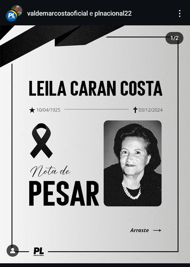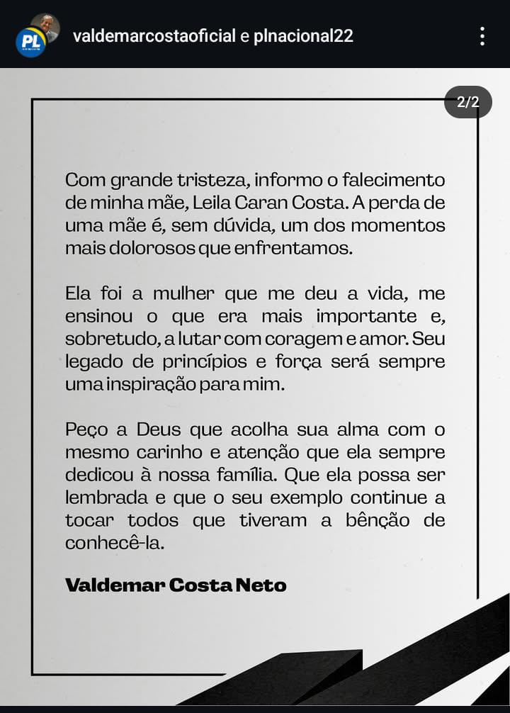 O presidente do PL e ex-deputado federal Valdemar Costa Neto comunicou, por meio das redes sociais, o falecimento de sua mãe, Leila Caran Costa, aos 99 anos, ocorrido na madrugada desta terça-feira (3), em Mogi das Cruzes. A causa da morte não foi divulgada.