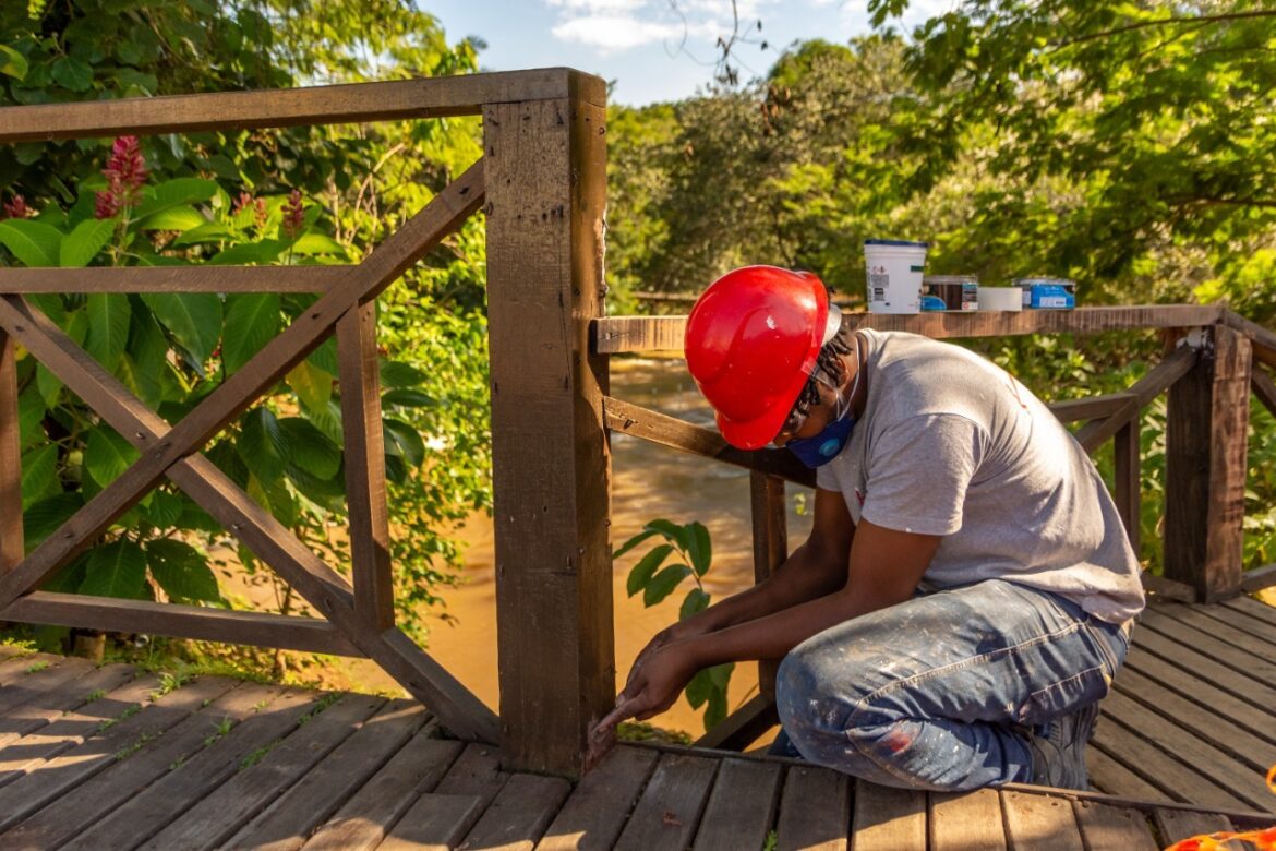 Com prazo de 30 dias para a conclusão, estão sendo realizados serviços de troca do madeiramento danificado, reforço nas estruturas, tratamento cupinicida, fugicida e acabamento em verniz do madeiramento.