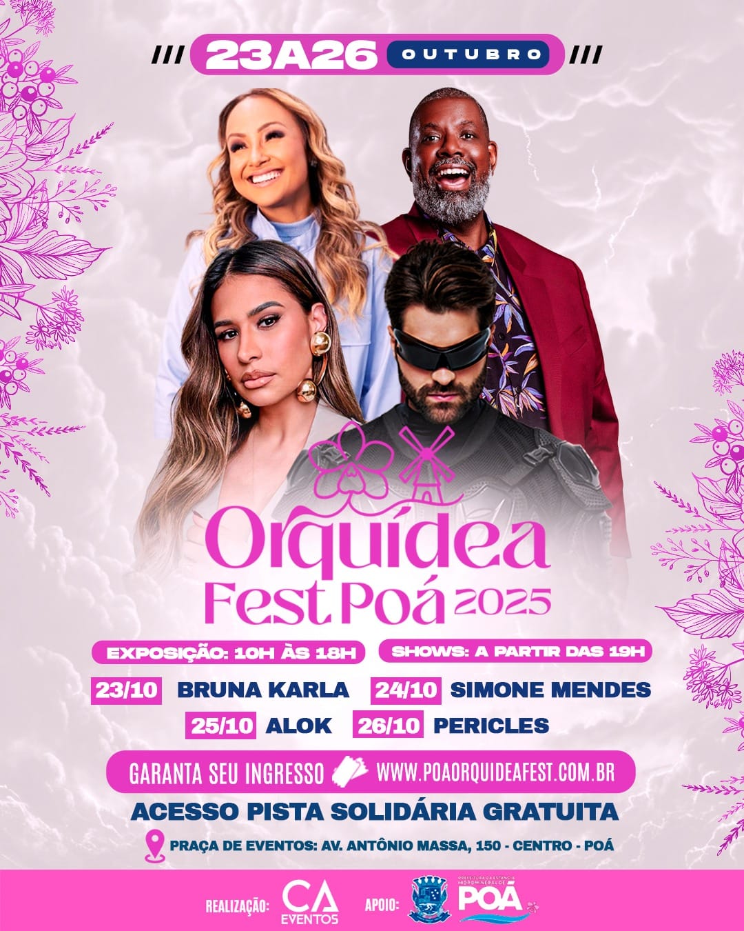 Faltando apenas três dias para a abertura, o prefeito convidou todos para prestigiar a festa, que será realizada de 23 a 26 de outubro, com entrada gratuita. Para os shows noturnos, ele reforçou a importância de fazer a reserva do ingresso solidário no site do evento. “Vamos celebrar nossa tradição, a beleza das orquídeas e o orgulho de ser poaense”, concluiu.