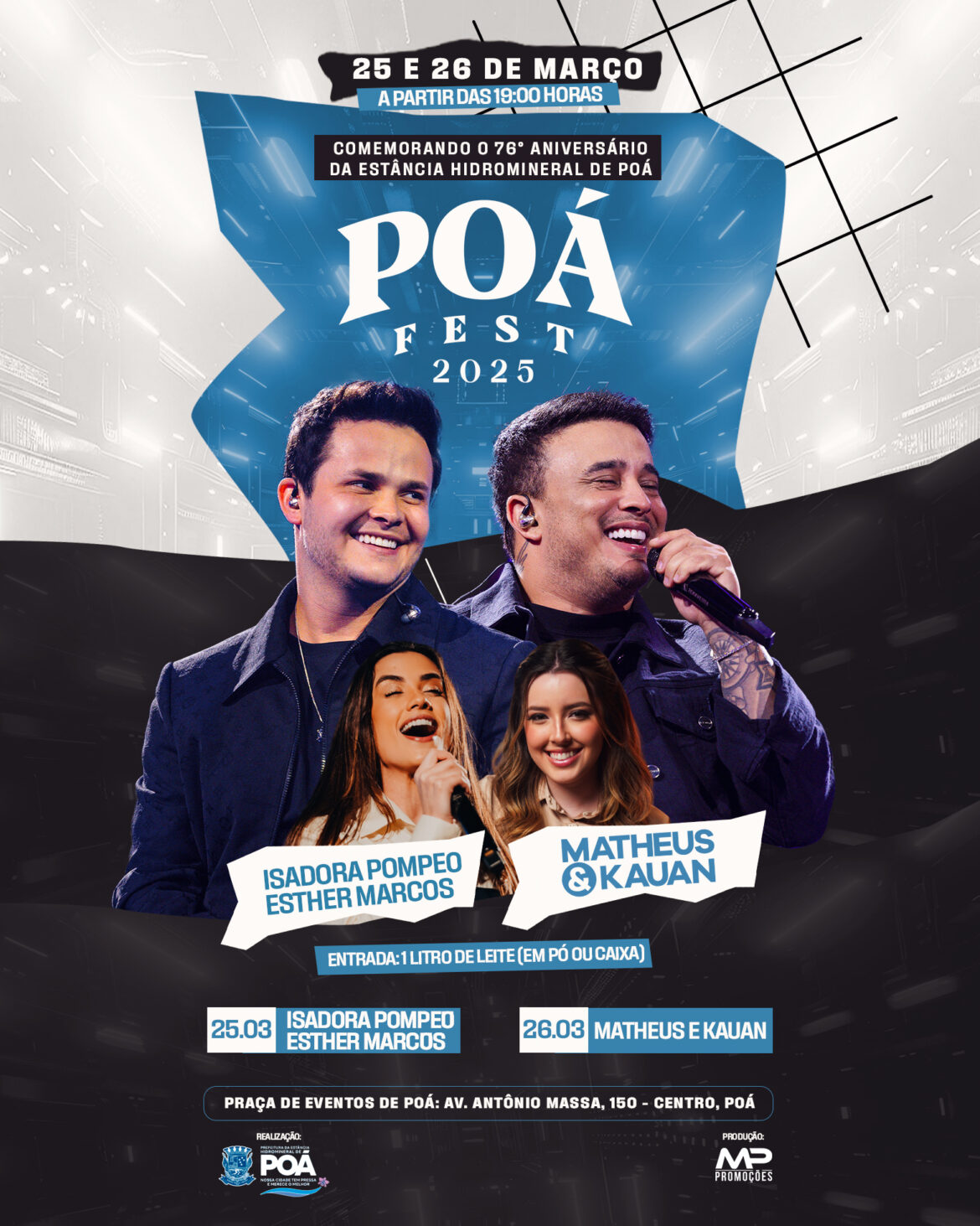Os shows do Poá Fest, em comemoração ao aniversário de 76 de emancipação político-administrativa da cidade, serão gratuitos para a população. Para conferir as cantoras gospel Esther Marcos e Isadora Pompeo, no dia 25 de março, e a dupla sertaneja Matheus & Kauan, no dia 26, será preciso apenas doar um litro de leite (caixa ou em pó) no dia do evento, antes de acessar a área onde acontecerão as apresentações musicais na Praça de Eventos Lucília Gomes Felippe. A ação social visa atender famílias em situação de vulnerabilidade do município.