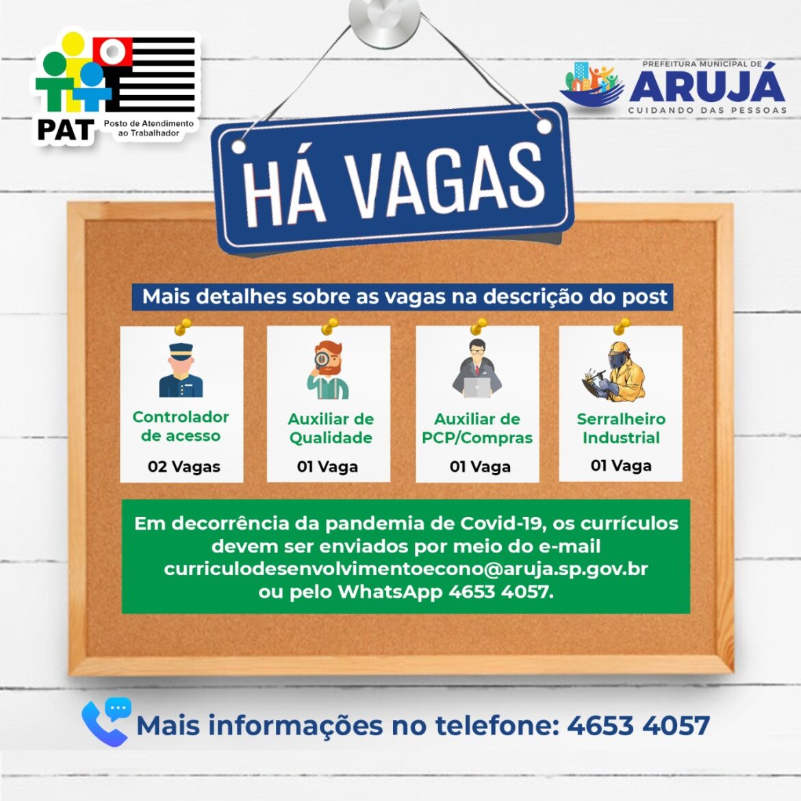 Em decorrência da pandemia de Covid-19, os currículos devem ser enviados por meio do e-mail curriculodesenvolvimentoecono@aruja.sp.gov.br. Outras informações podem ser obtidas pelo telefone da unidade 4653 4057. Seguem as ocupações disponíveis e suas especificações: