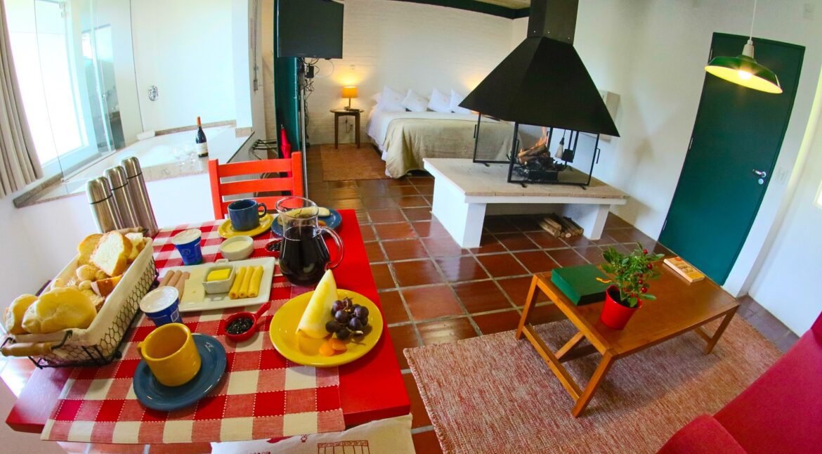 Se hospedar no Encontro da Pedra é quase como ter sua própria casa no interior. As características do espaço garantem um ar bem familiar. A suíte ampla tem também uma sala de estar e mini copa com frigobar, micro-ondas e pia. Para fugir do frio, uma lareira central torna o ambiente mais cômodo e charmoso. Inclui ainda comodidades como wi-fi, TV com canais pagos e estacionamento gratuito.