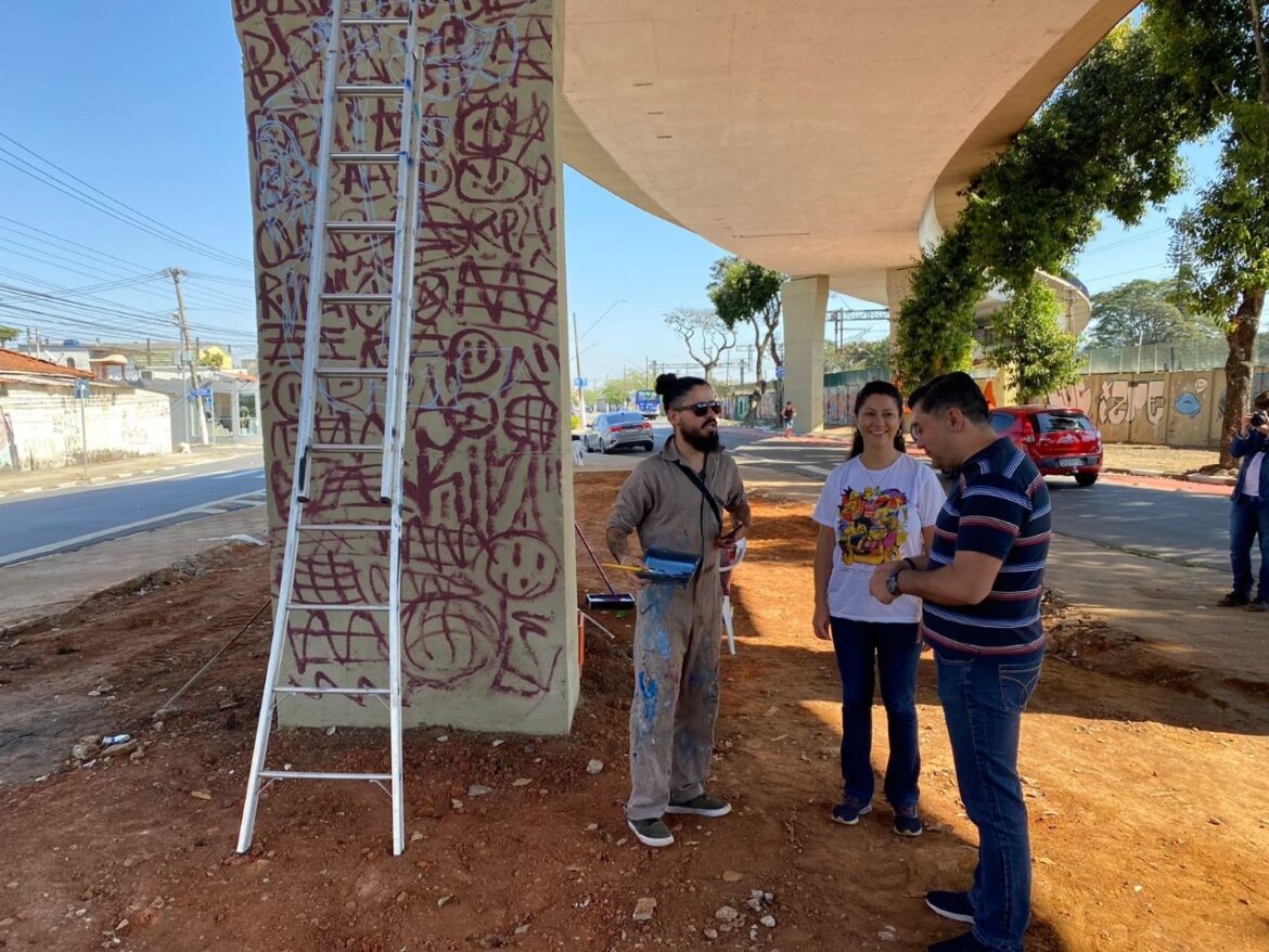 Prefeito de Suzano acompanha pintura de murais no viaduto Ryu Mizuno
