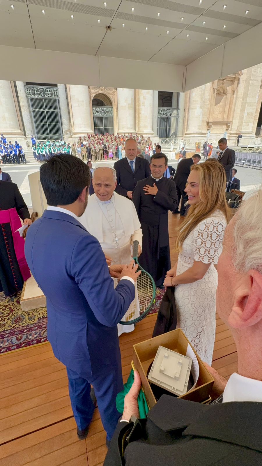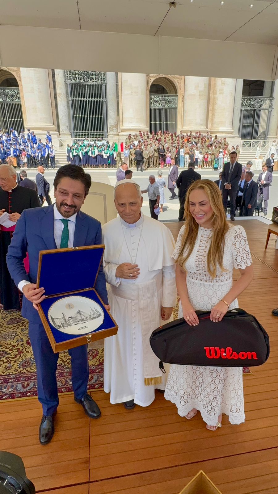Leão XIV, que é fã e praticante de tênis, agradeceu pelos presentes e abençoou uma bandeira da cidade, que o prefeito Ricardo Nunes trará para a capital ao fim da sua agenda na Itália, onde está em missão oficial para estreitar laços institucionais com governos locais, ampliar projetos conjuntos nas áreas de desenvolvimento urbano sustentável, inovação, cultura e alimentação, além de reforçar a histórica irmandade entre São Paulo e Milão, estabelecida em 1962.