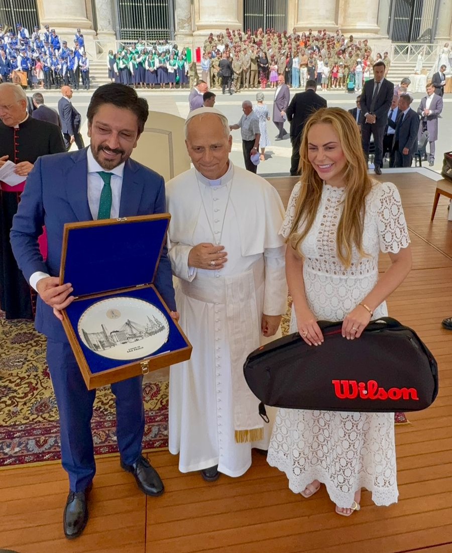 A primeira-dama, Regina Nunes, também falou sobre o momento emocionante do encontro com o papa Leão XIV. “Foi maravilhoso. A gente entregou a raquete da Bia Haddad, eu vi que ele ficou muito feliz. É maravilhoso representar a nossa casa, a nossa família, a nossa São Paulo. Então a gente está muito feliz”, disse.