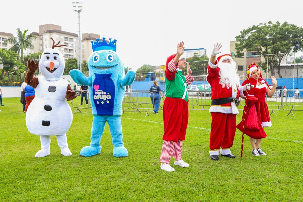 Nem a chuva atrapalhou a chegada do Papai Noel, que veio especialmente a Arujá e de helicóptero, a convite do Fundo Social de Solidariedade, na manhã de domingo (15), no Estádio Municipal “Dr Armando Maiolino”, no Jardim Planalto.