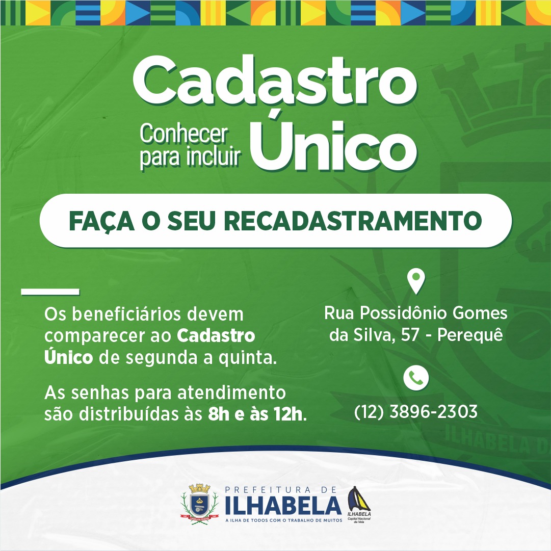 Serviço: O Cadastro Único fica na Rua Possidônio Gomes da Silva, 57 Perequê. Telefone: (12) 3896-2303.