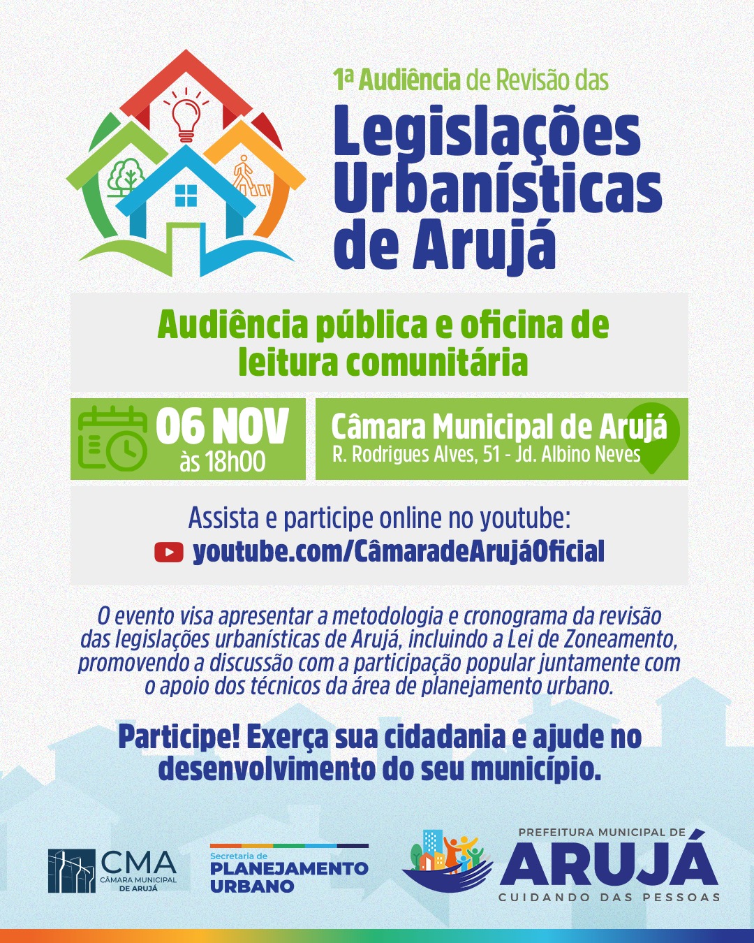 A Prefeitura de Arujá, por meio da Secretaria de Planejamento Urbano, realizará no dia 06 de novembro, às 18h, a 1ª Audiência Pública para a Revisão das Legislações Urbanísticas de Arujá. A sessão ocorrerá na Câmara Municipal, localizada na Rua Rodrigues Alves, 51, Jardim Albino Neves.