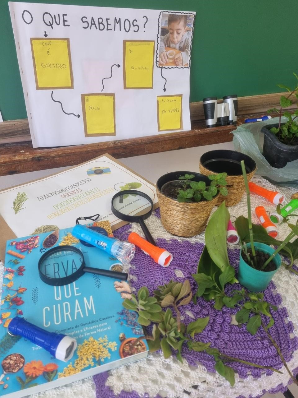 O início se dá com uma roda de conversa sobre o dia a dia. Entre os temas estão o chá, bebida preparada por meio da infusão de folhas secas. Quando uma das crianças perguntou se chá poderia ser considerado remédio, a Professora Cíntia Mota deu início a uma pesquisa.