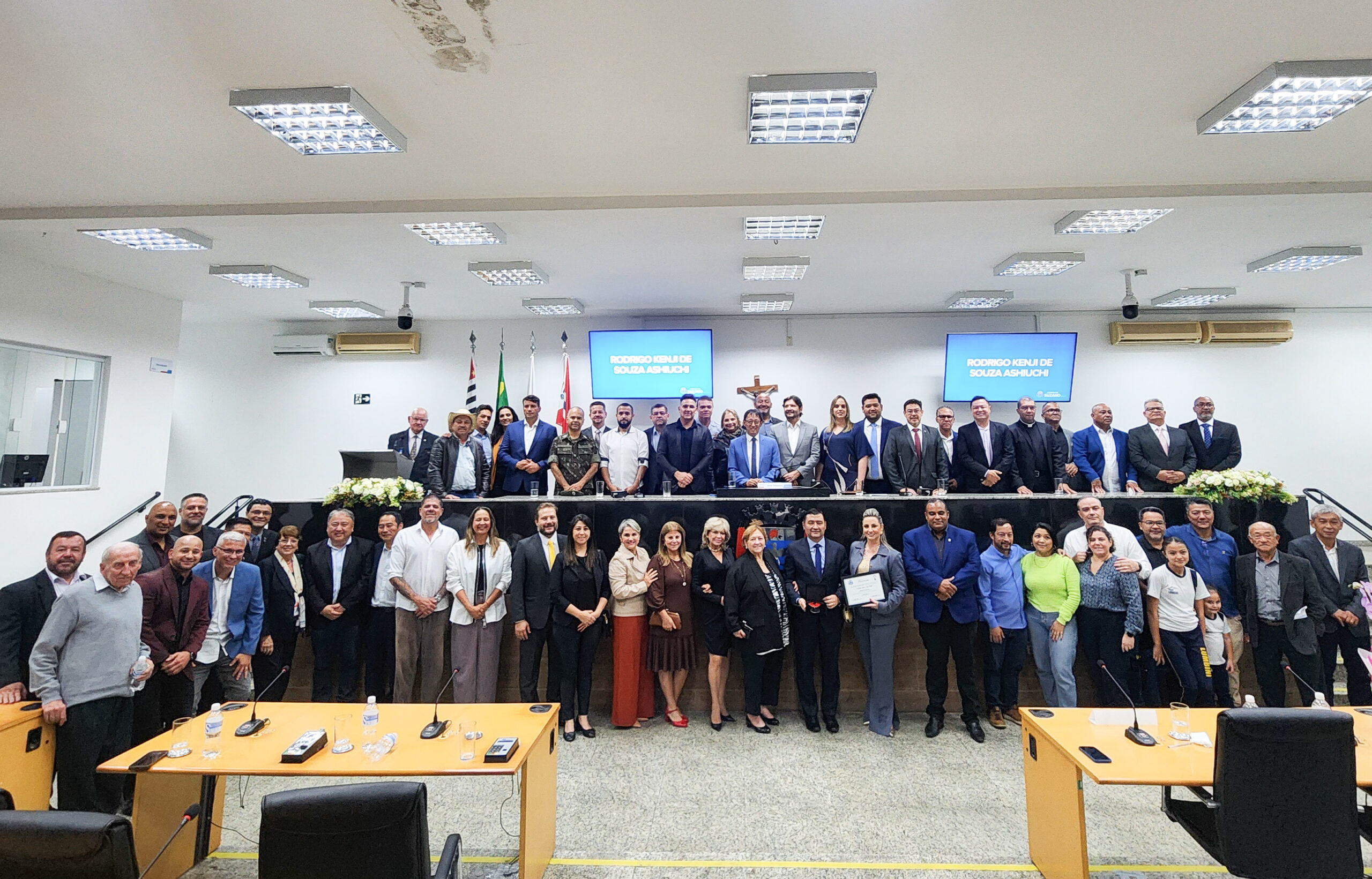Em uma sessão solene marcada pela emoção, o ex-prefeito e atual secretário do Verde e do Meio Ambiente da Prefeitura de São Paulo, Rodrigo Ashiuchi (PL), recebeu a Medalha Suzano Brandão da Câmara de Suzano, em uma sessão solene realizada na noite de sexta-feira (11), que lotou o Plenário e a Galeria da Casa de Leis.
