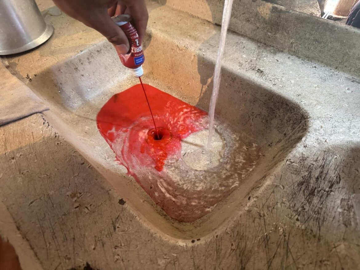 O teste de corante consiste em despejar o produto diretamente em vasos sanitários, pias e caixas de inspeção, permitindo o rastreamento da água colorida pelas redes de esgoto. Esse procedimento é seguro e não apresenta riscos à saúde dos moradores.