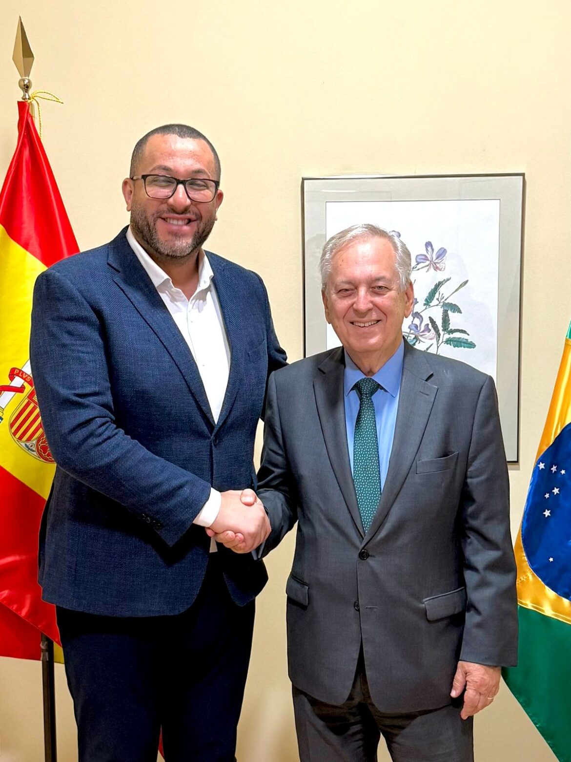 O prefeito Saulo Souza, se encontrou, em Madrid, com o embaixador do Brasil na Espanha, Luiz Alberto Figueiredo Machado, durante a Missão Espanha, promovida pela Frente Nacional de Prefeitos e Prefeitas (FNP), em Barcelona. A agenda, realizada na semana passada, marcou um momento estratégico de fortalecimento das relações internacionais e de busca por cooperação técnica e institucional em áreas como inovação, sustentabilidade e mobilidade urbana.