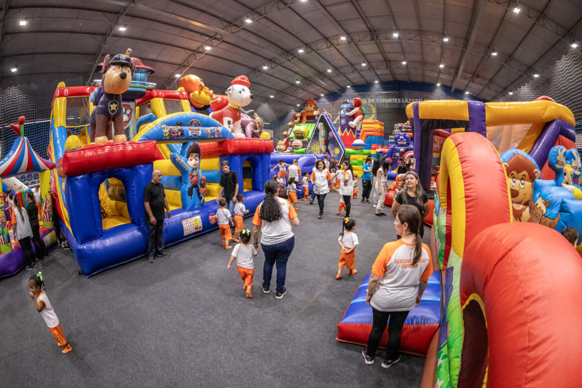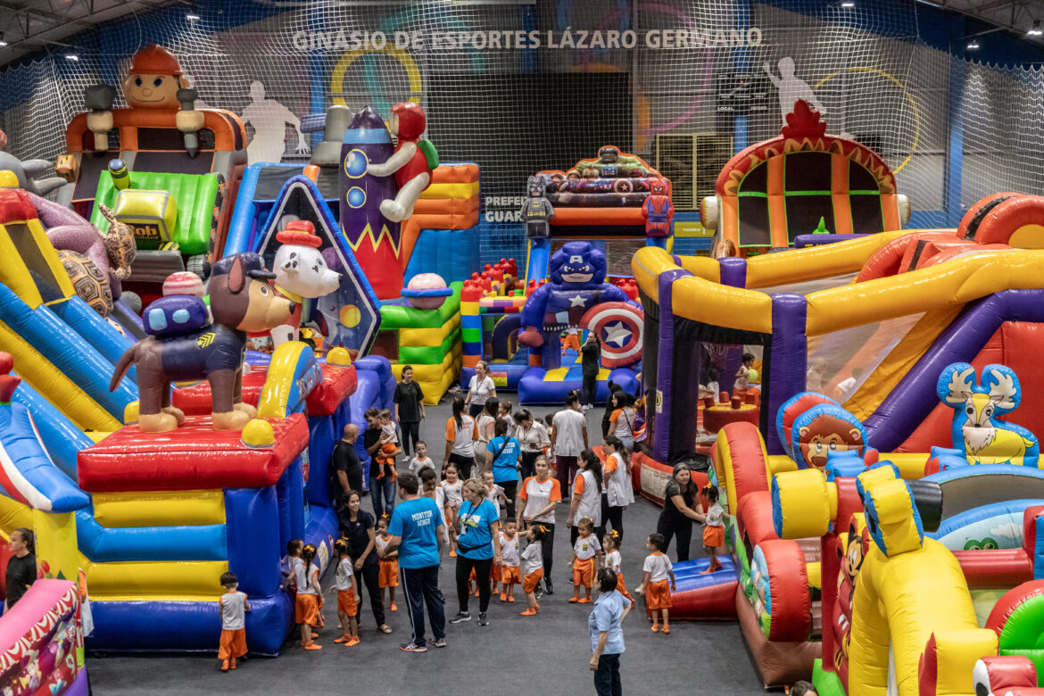 Brinquedos infláveis temáticos da Patrulha Canina, do Capitão América, do Bob o Construtor, do Mickey e de outros personagens ocupam toda a quadra, que está colorida e cheia de opções divertidas e lúdicas.