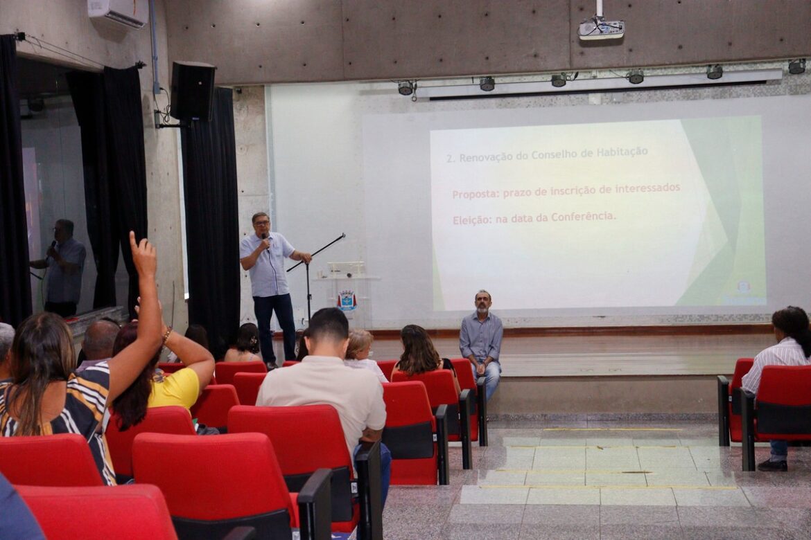 As definições sobre o evento foram debatidas na primeira reunião preparatória, feita em 3 de maio, no Cineteatro Wilma Bentivegna, em que estiveram reunidas 40 pessoas, entre elas representantes do Conselho Municipal de Desenvolvimento Urbano e Rural (Comdur), do Conselho Municipal de Habitação (CMH) e do Conselho Municipal de Transporte (CMT), além de membros de entidades civis ligadas à questão da moradia.